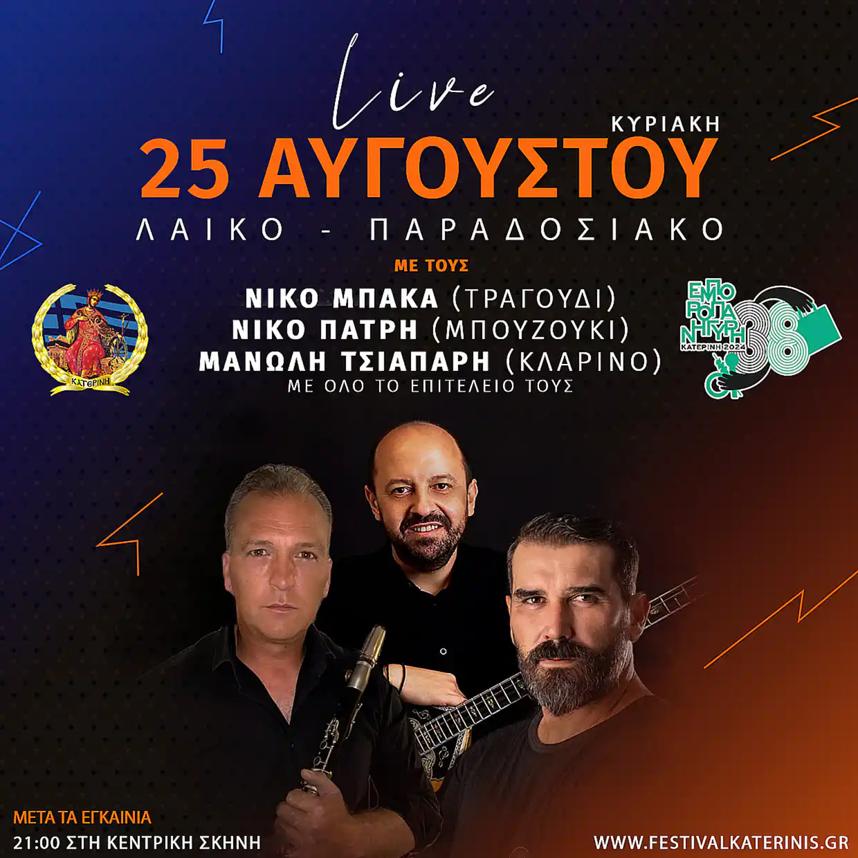 Αμέσως μετά και πιο συγκεκριμένα στις 21:30 η κεντρική σκηνή θα φιλοξενήσει ένα λαϊκό – παραδοσιακό live με τους Nίκο Μπάκα (τραγούδι), Νίκο Πατρή (Μπουζούκι), Μανώλη Τσιαπαρή (κλαρίνο) και όλο το επιτελείο τους.