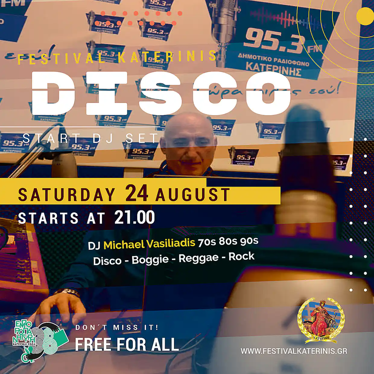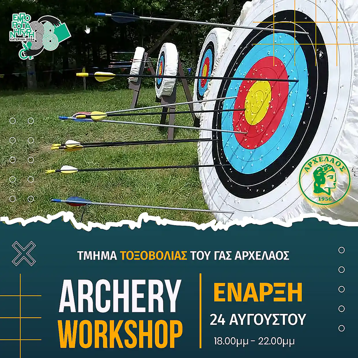Το Σάββατο 24/08 το SET των DJ’s παρουσιάζει στις 21:00: Disco με τον Michael Vasiliadis (70s – 80s – 90s Disco/Boogie/Reggae/Rock), στις 22:00 Music Party με τον Savo και συνεχίζει με τον DJ Bilia (Delulu). Νωρίτερα στις 18:00 και έως τις 22:00 το τμήμα τοξοβολίας του «Αρχέλαου» Κατερίνης, πραγματοποιεί επίδειξη – εκμάθηση τοξοβολίας.