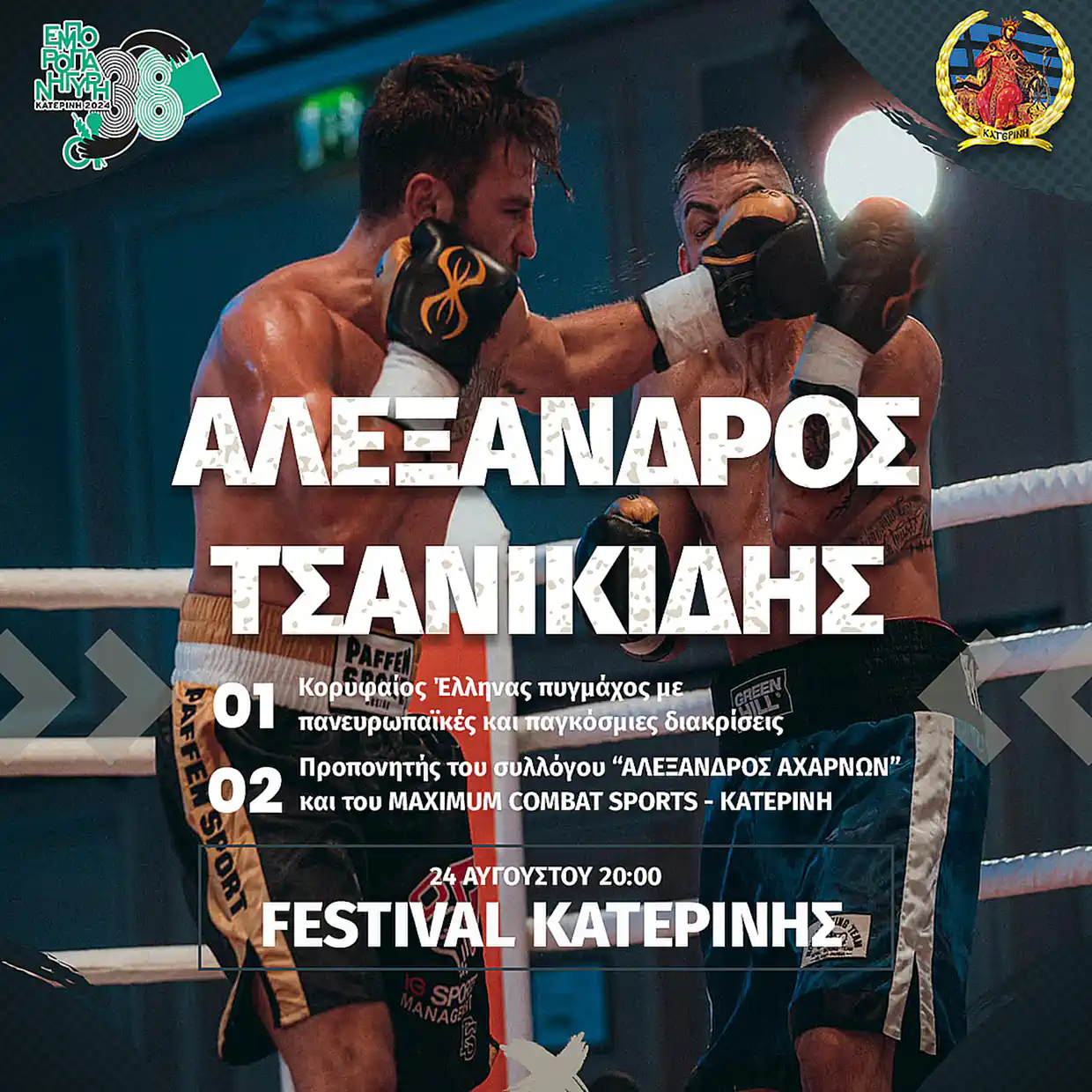 Παράλληλα ο Σ.Ε.Ο. Κατερίνης και οι «Ελεύθεροι Ποδηλάτες» παρουσιάζουν επίδειξη ικανοτήτων με ποδήλατα BMX. Στις 20:00 ο κορυφαίος Έλληνας πυγμάχος Αλέξανδρος Τσανικίδης παρουσιάζει επίδειξη αμυντικής τέχνης.