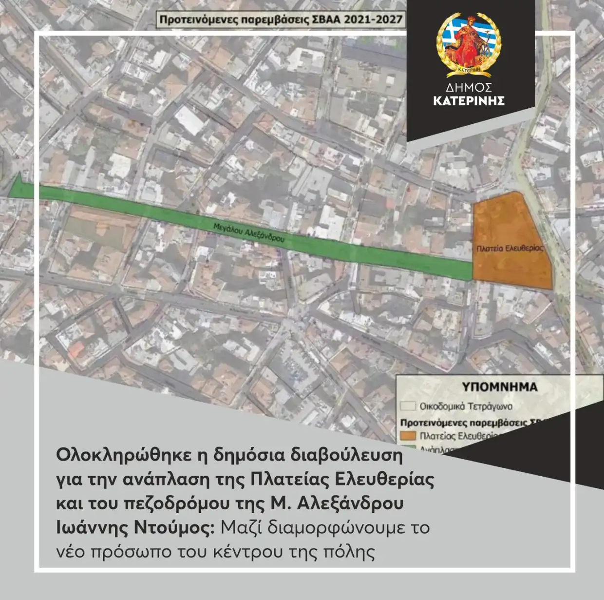 Μεγάλη ανταπόκριση βρήκε η δημόσια διαβούλευση που διοργάνωσε ο Δήμος Κατερίνης για την ανάπλαση της Πλατείας Ελευθερίας και του πεζοδρόμου της Μ. Αλεξάνδρου. Η διαδικασία ολοκληρώθηκε με σημαντική συμμετοχή και ανέδειξε τις βασικές κατευθύνσεις που οι πολίτες επιθυμούν να ακολουθηθούν.