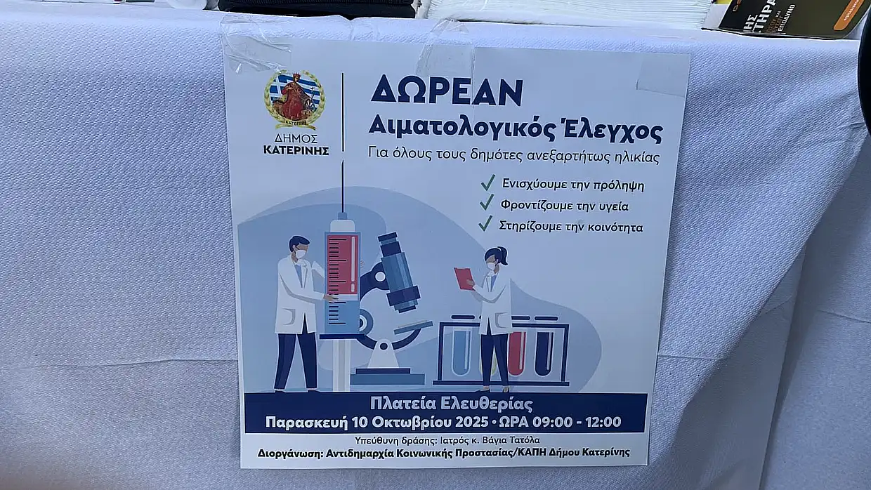 Η αντιδημαρχία Κοινωνικής Προστασίας σε συνεργασία με το ΚΑΠΗ Κατερίνης πραγματοποιεί δωρεάν αιματολογικούς ελέγχους για όλους τους δημότες σήμερα Παρασκευή 10 Οκτωβρίου από τις 09:00 π.μ έως τις 12:00 μ.μ..