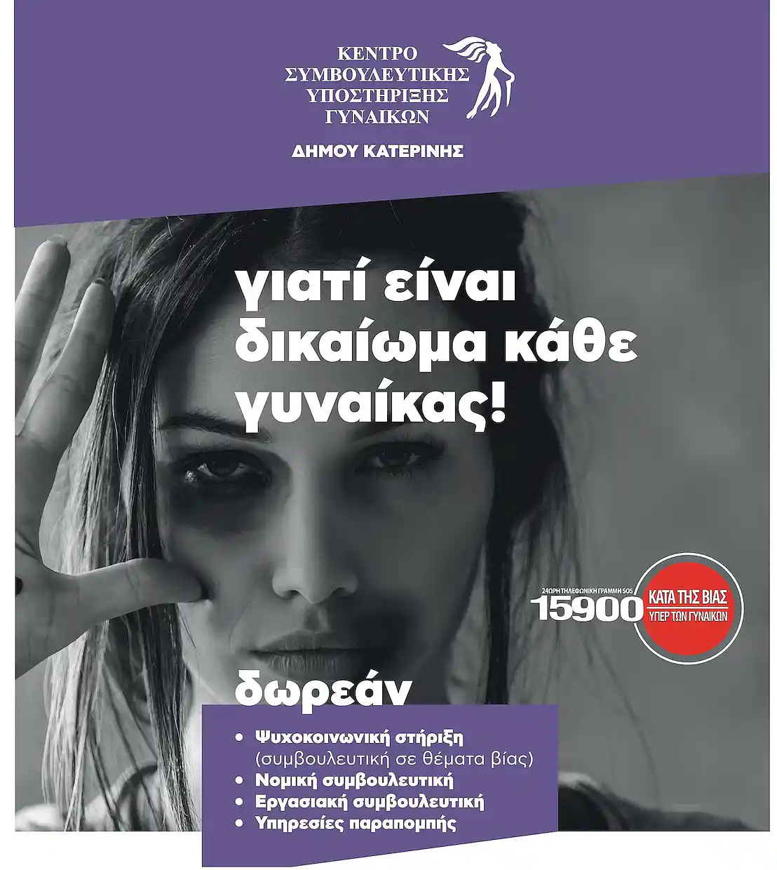Το Κέντρο Συμβουλευτικής Υποστήριξης Γυναικών του Δήμου Κατερίνης, στο πλαίσιο της συνεχούς ενημέρωσης και ευαισθητοποίησης της τοπικής κοινωνίας και με αφορμή την 25η Νοεμβρίου, Παγκόσμια Ημέρα για την Εξάλειψη της Βίας κατά των Γυναικών, ένα παγκόσμιο και διαχρονικό κοινωνικό φαινόμενο που μας αφορά όλους, θα πραγματοποιήσει τις εξής δράσεις: