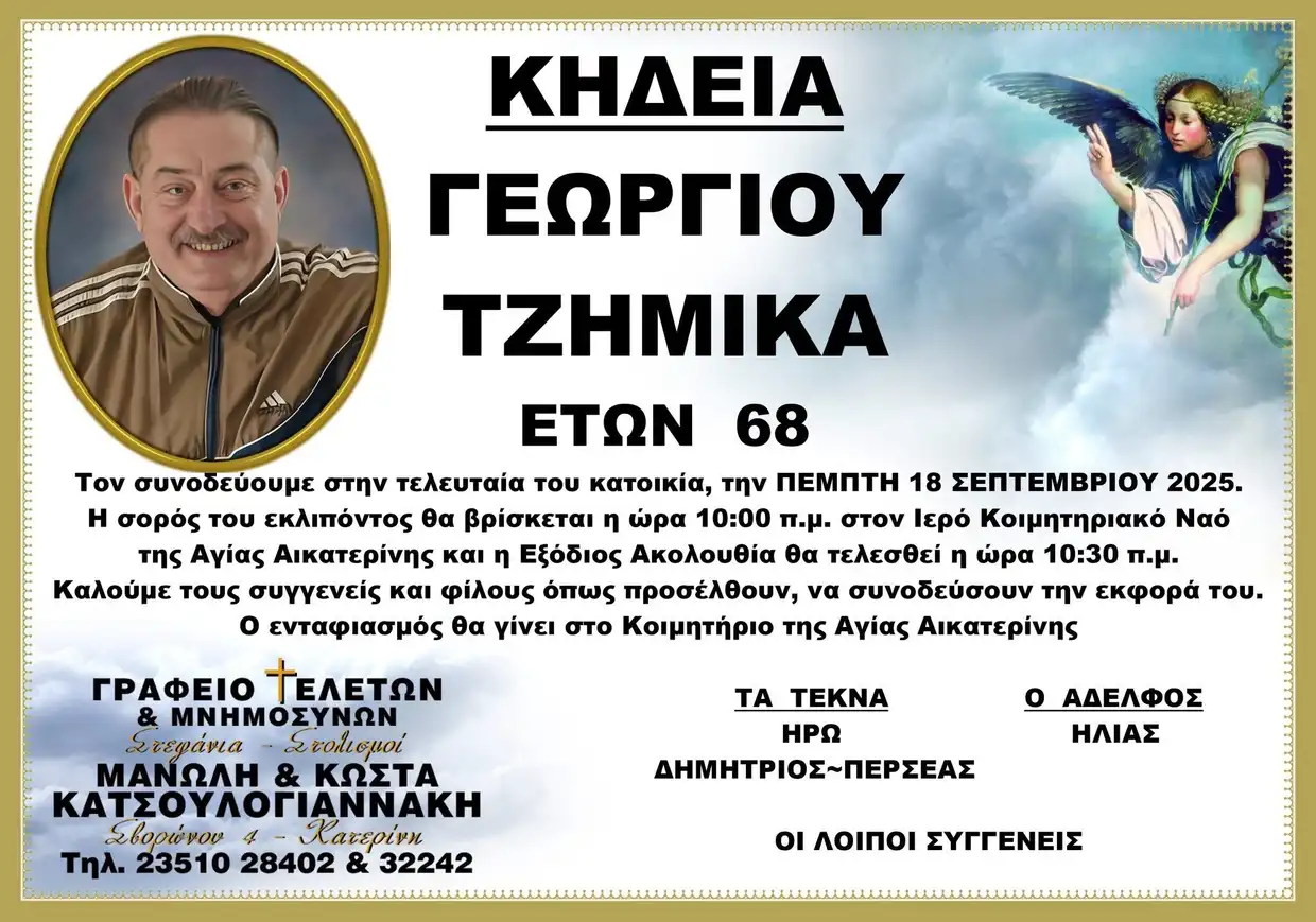 Ολύμπιο Βήμα » Επικαιρότητα » Κοινωνικά » Κατερίνη: Έφυγε από τη ζωή ο γνωστός επιχειρηματίας Γεώργιος Τζιμήκας σε ηλικία 68 ετών
