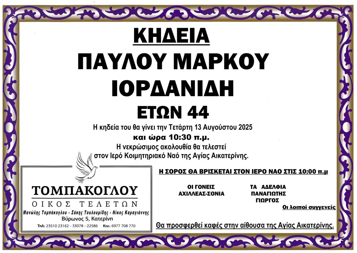 Ολύμπιο Βήμα » Επικαιρότητα » Κοινωνικά » Κατερίνη: Έφυγε από την ζωή ο Παύλος-Μάρκος Ιορδανίδης σε ηλικία 44 ετών