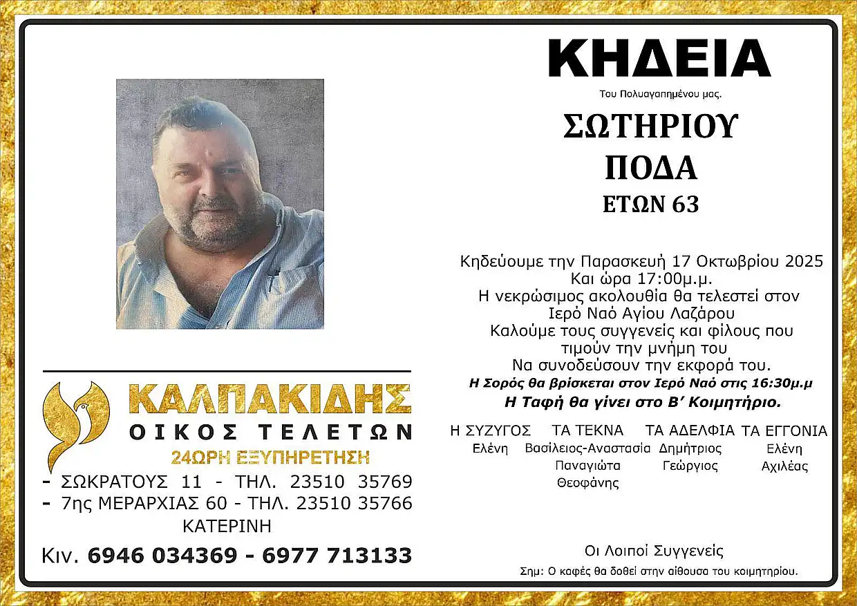 Ολύμπιο Βήμα » Επικαιρότητα » Κοινωνικά » Κατερίνη: Έφυγε από την ζωή ο Σωτήριος Πόδας σε ηλικία 63 ετών
