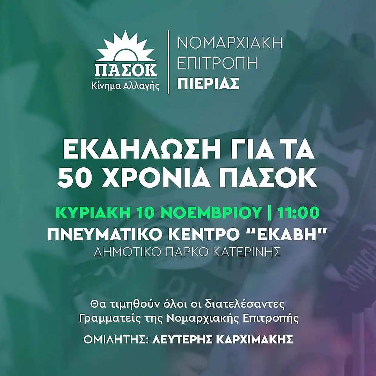 Την Κυριακή 10 Νοεμβρίου και ώρα 11:00 στο Πνευματικό Κέντρο ΕΚΑΒΗ θα πραγματοποιηθεί εκδήλωση για τα 50 χρόνια ΠΑΣΟΚ με ομιλητή τον Λευτέρη Καρχιμάκη.