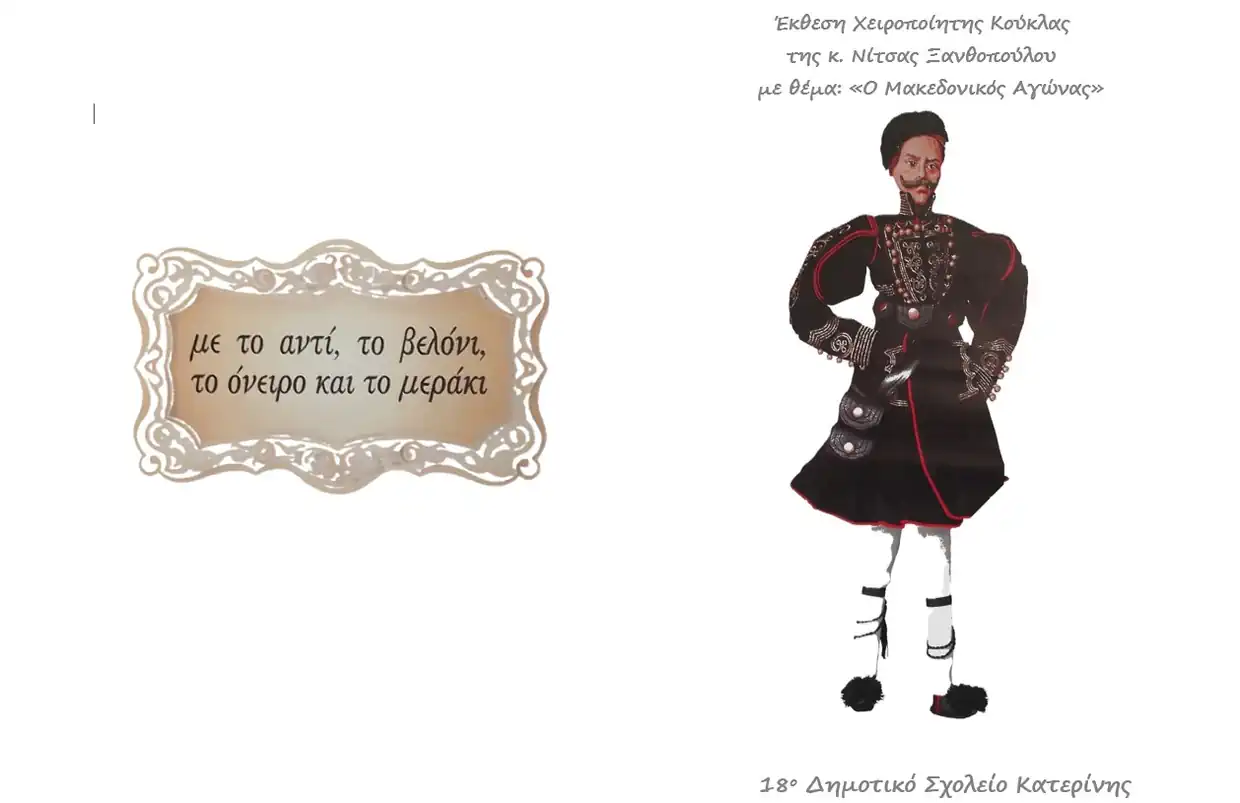 Το 18ο Δημοτικό Σχολείο Κατερίνης και η εικαστικός Νίτσα Ξανθοπούλου προσκαλούν το κοινό στη μουσική – ιστορική εκδήλωση εγκαινίων της Έκθεσης Χειροποίητης Κούκλας, με θέμα «Ο Μακεδονικός Αγώνας». Η εκδήλωση θα πραγματοποιηθεί τη Δευτέρα 10 Νοεμβρίου 2025, στις 18:00, στον χώρο πολλαπλών εκδηλώσεων του σχολείου.
