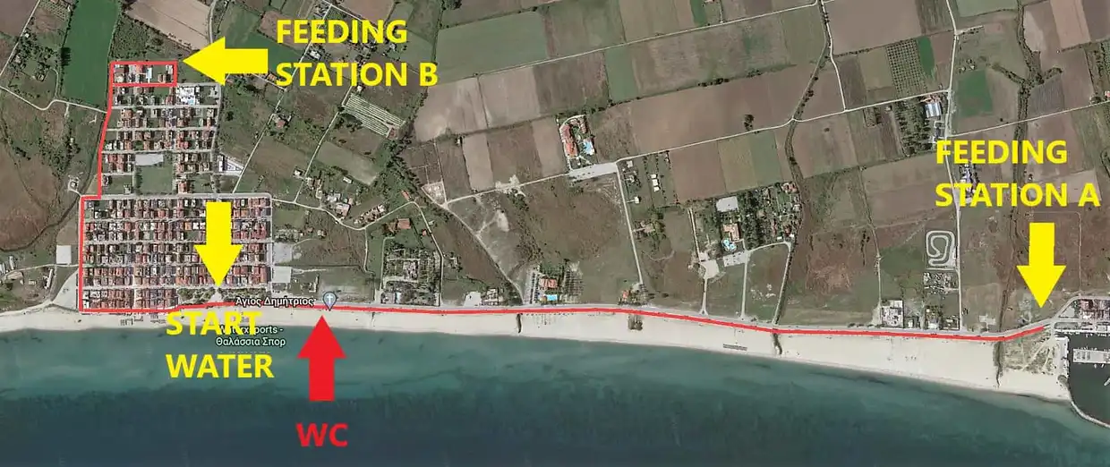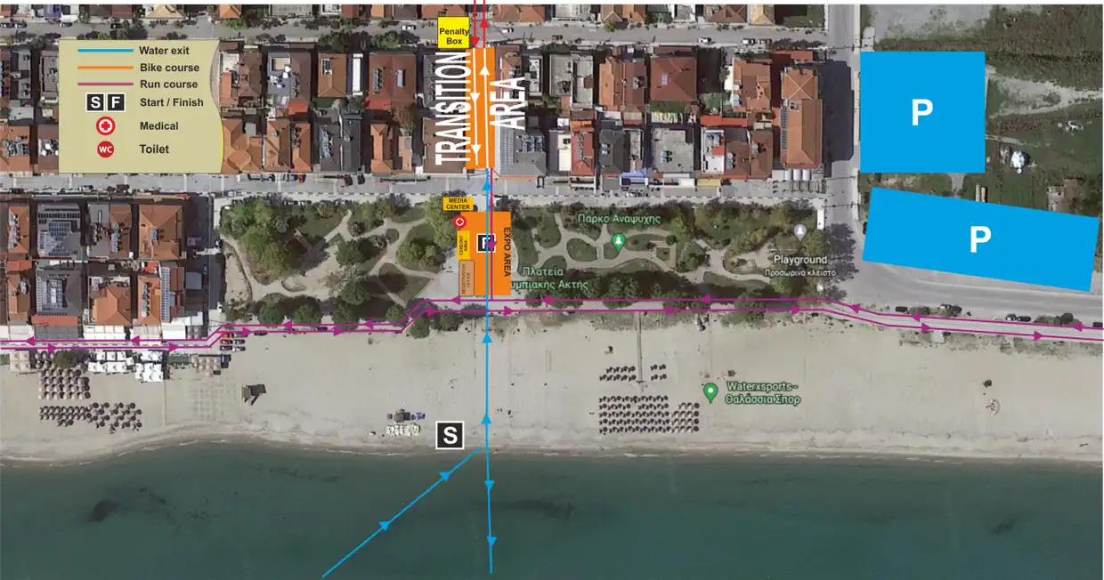 Κατά τη διάρκεια του αγώνα τρεξίματος, θα χρησιμοποιηθεί ο παραλιακός πεζόδρομος της Ολυμπιακής Ακτής – Παραλίας και οι οδοί Αφροδίτης, νότιας οδού Ολυμπιακής Ακτής (δίπλα στο νότιο πάρκινγκ), Ερμού, Μελπομένης, Καλλιόπης και Πολυμνίας.