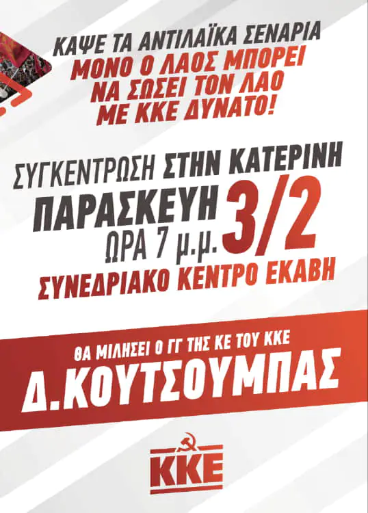 συγκέντρωση της Τ.Ε Πιερίας του ΚΚΕ, στο συνεδριακό κέντρο του δήμου Κατερίνης “ΕΚΑΒΗ” στις 7:00 μ.μ.