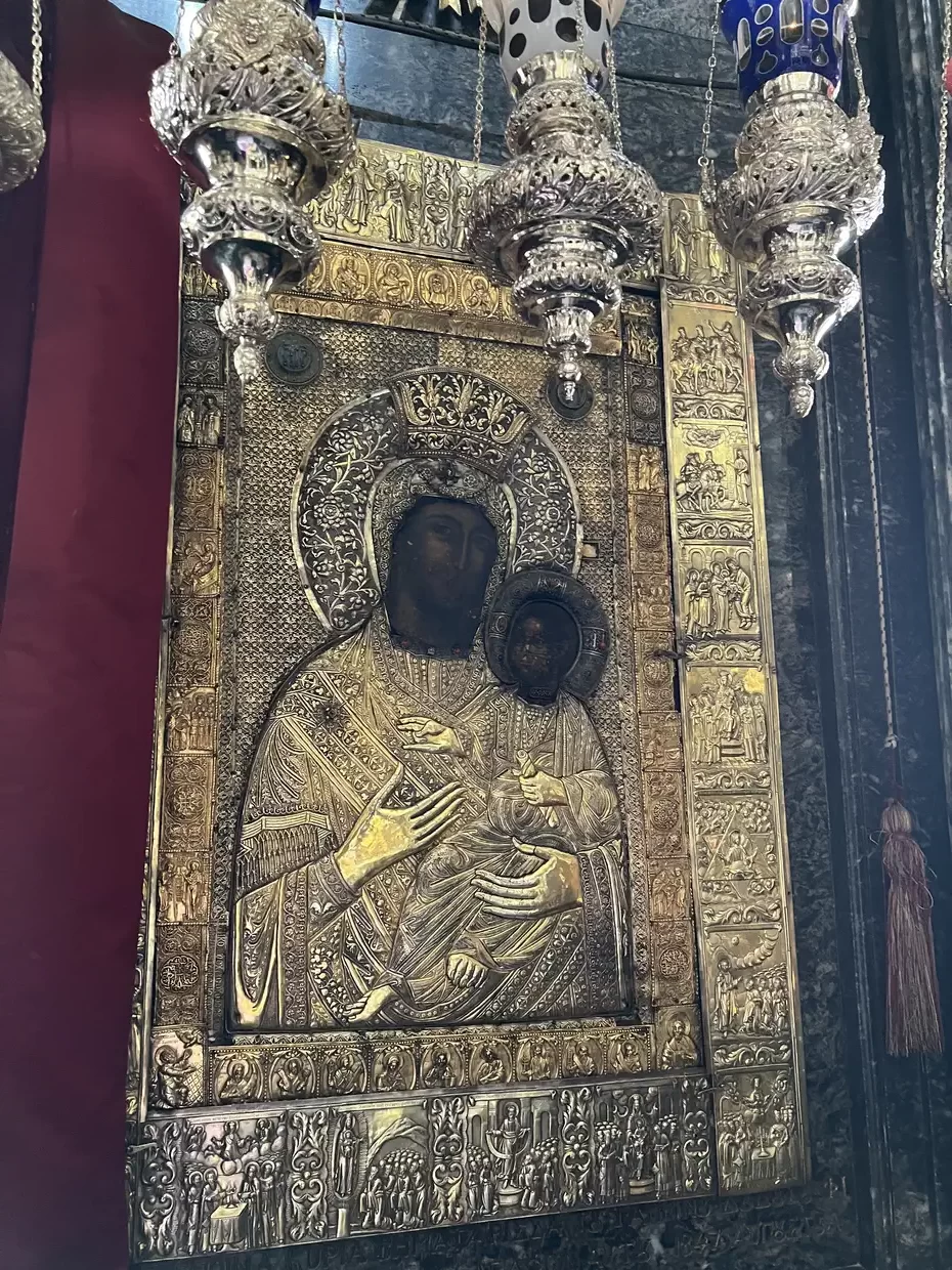 Η εικόνα αυτή βρίσκεται σήμερα στο σύνθρονο του ιερού βήματος, λέγεται δε και “Κτιτόρισσα”, από το γεγονός ίσως ότι η ανεύρεσή της σχετίζεται με την ανοικοδόμηση της μονής από τους τρείς αδελφούς και κτίτορες της μονής, Αθανάσιο, Νικόλαο και Αντώνιο, που μόνασαν περί τα τέλη του Ι’ αιώνα.