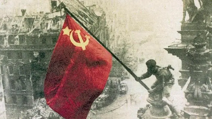 κόκκινη σημαία με το σφυροδρέπανο κυμάτιζε πάνω από το βομβαρδισμένο Ράιχσταγκ.