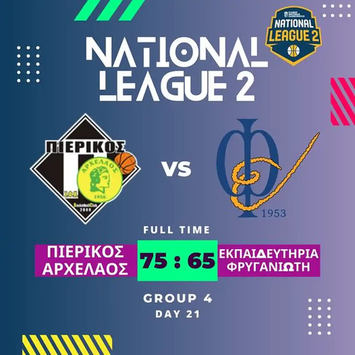 Ο Πιερικός Αρχέλαος επικράτησε άνετα με 75-65 των Εκπαιδευτηρίων Φρυγανιώτη, στο Κλειστό Γυμναστήριο Σιδ. Σταθμού Κατερίνης στο πλαίσιο της 21ης αγωνιστικής του 2ου ομίλου της National League 2.