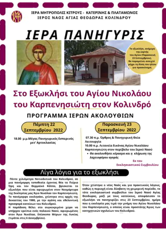 Όταν χτίστηκε ο νέος Ναός και για πρακτικούς λόγους, καθώς η περιοχή είναι δύσβατη τη χειμερινή περίοδο, το τότε εκκλησιαστικό συμβούλιο του Ιερού Ναού Αγίας Θεοδώρας, μαζί με τους κατοίκους, αποφάσισαν το εξωκλήσι να πανηγυρίζει στις 23 Σεπτεμβρίου, ημέρα που η εκκλησία μας τιμά την μνήμη του Αγίου Νικολάου του Καρπενησιώτη, ο οποίος είναι προστάτης Άγιος των κατηχητικών σχολείων του Κολινδρού.