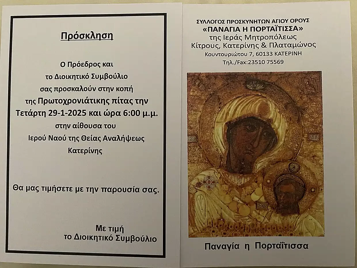 Ο Πρόεδρος και το Διοικητικό Συμβούλιο σας προσκαλούν στην κοπή της Πρωτοχρονιάτικης πίτας την Τετάρτη 29-1-2025 και ώρα 6.00 μ.μ. στην αίθουσα του Ιερού Ναού της Θείας Αναλήψεως Κατερίνης.