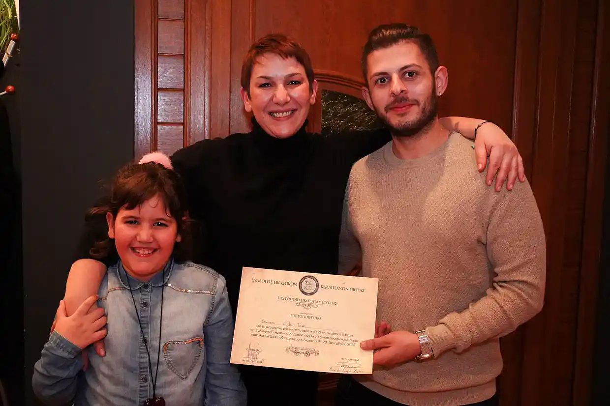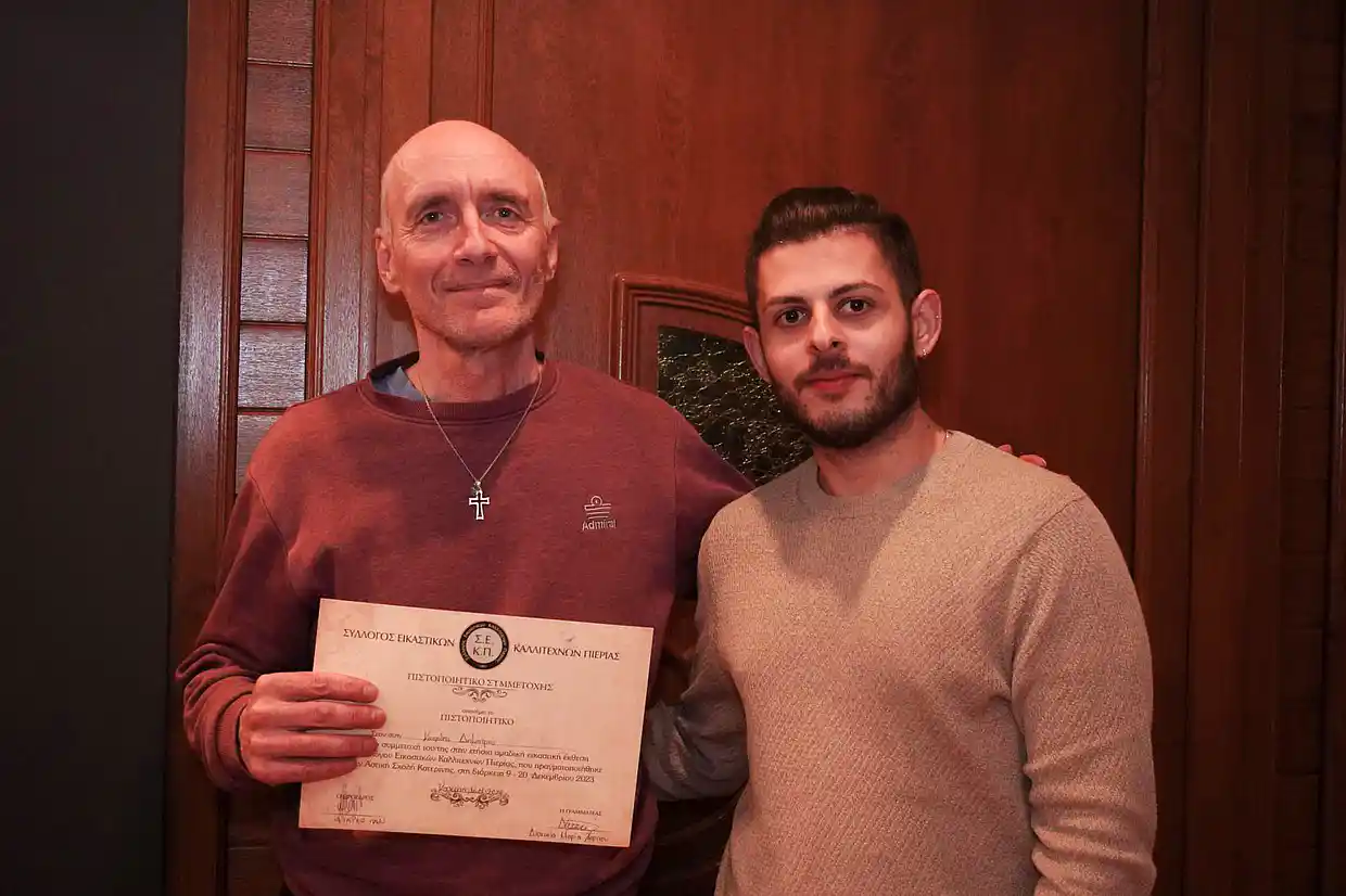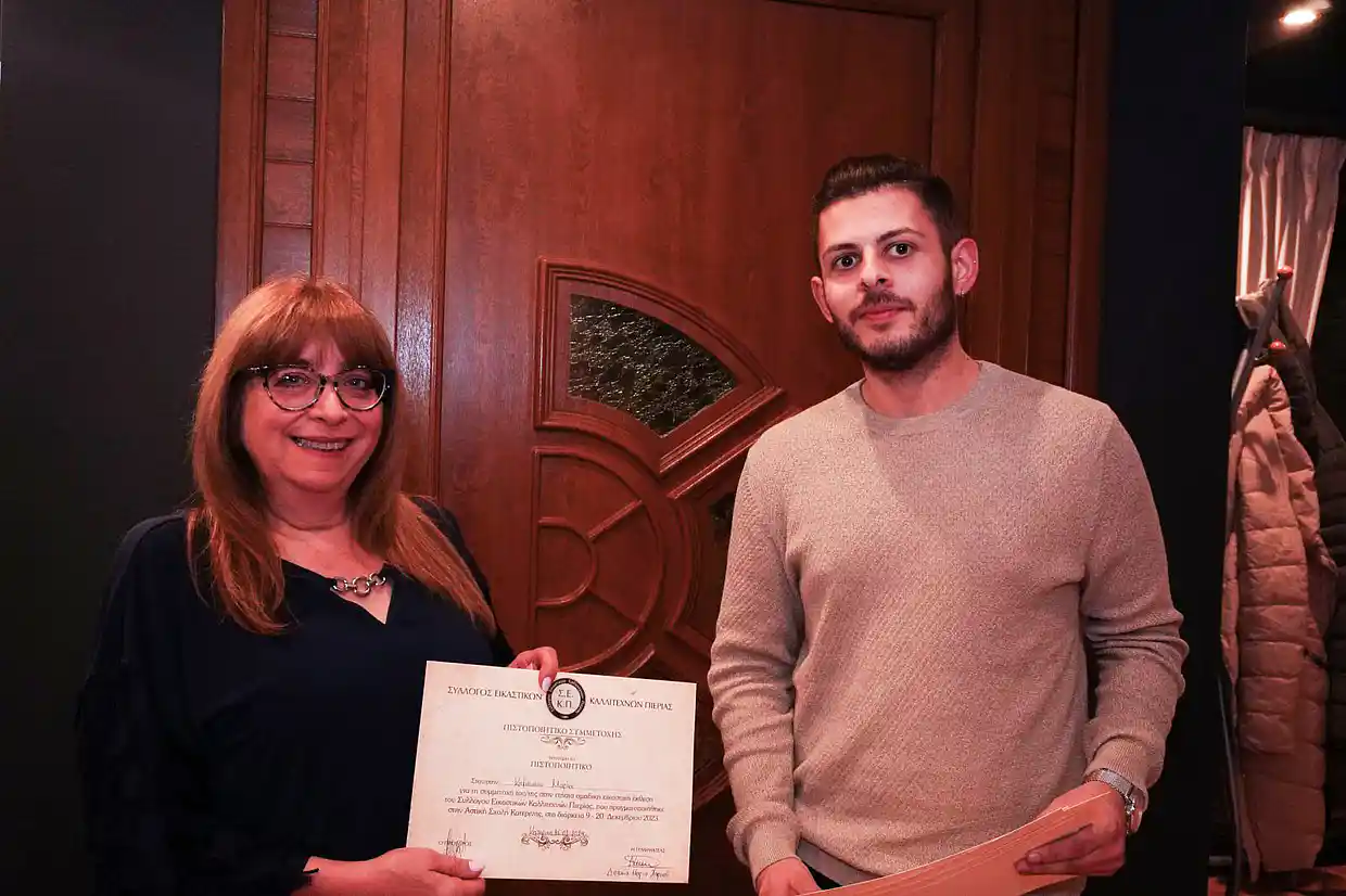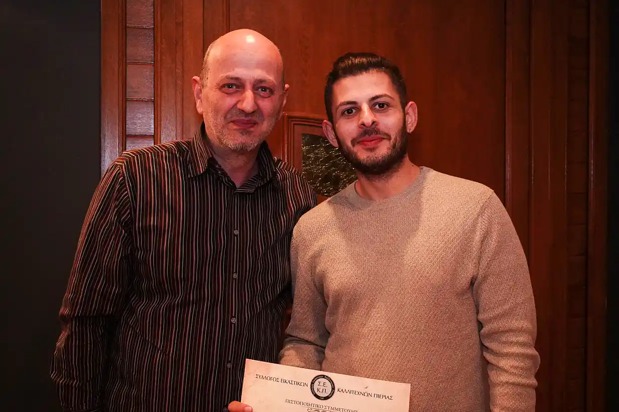 Στην διάρκεια της βραδιάς απονεμήθηκαν βεβαιώσεις στους συμμετέχοντες στην ετήσια ομαδική εικαστική έκθεση του Συλλόγου Εικαστικών Καλλιτεχνών Πιερίας, που πραγματοποιήθηκε στην Αστική Σχολή Κατερίνης, στη διάρκεια 9-20 Δεκεμβρίου 2023.