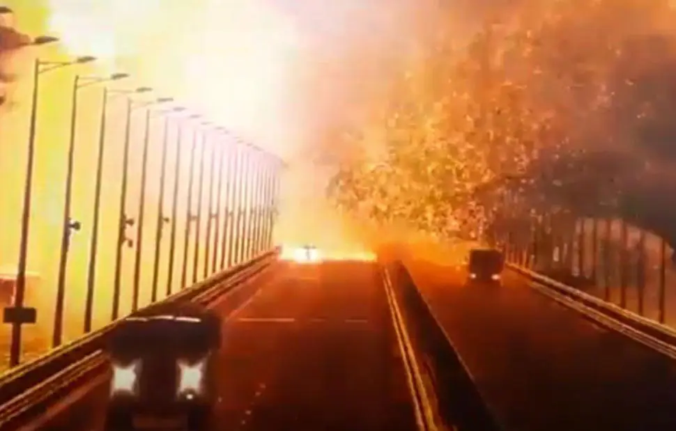 Οι ρωσικές αντιτρομοκρατικές αρχές ανακοίνωσαν, σύμφωνα με το κρατικό πρακτορείο ειδήσεων TASS, ότι φορτηγό εξερράγη στο οδικό τμήμα της γέφυρας, προκαλώντας φωτιά σε δεξαμενές καυσίμων ενός τρένου που κατευθυνόταν προς τη χερσόνησο της Κριμαίας.