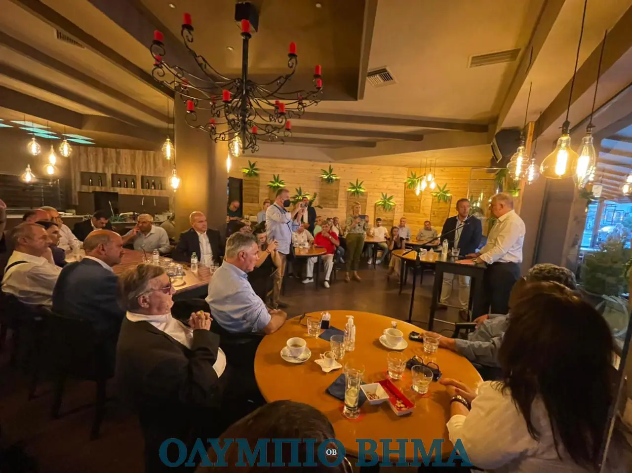 Το Κλιμάκιο αμέσως μετά την ολοκλήρωση των κατά τόπους επισκέψεων συναντήθηκε και συνομίλησε με πολίτες, μέλη και στελέχη στο καφέ «Αμέθυστος» στην Κατερίνη. Η υποδοχή στην Κατερίνη του κλιμακίου ήταν θερμότατη και ο χώρος κατακλύστηκε από οπαδούς της Νέας Δημοκρατίας.