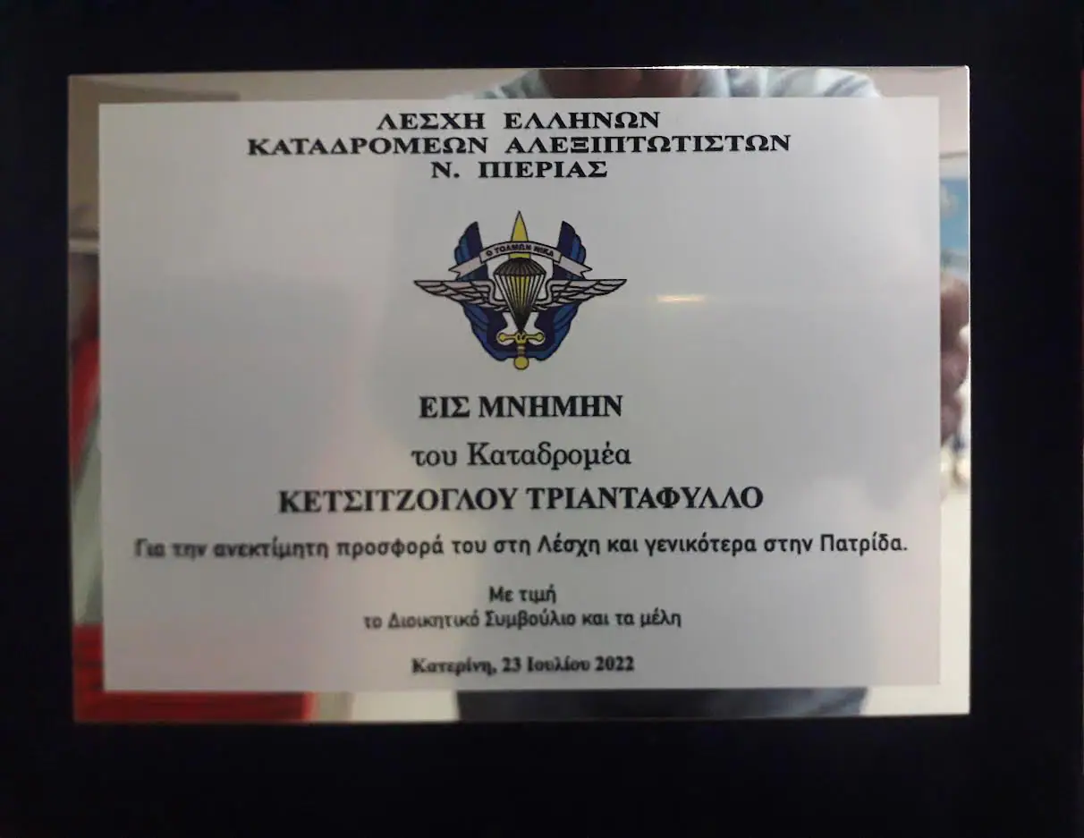 Η πρωτοβουλία της απονομής ήταν ένας ελάχιστος φόρος τιμής του Διοικητικού Συμβουλίου και των Μελών της Λέσχη Ελλήνων Καταδρομέων Αλεξιπτωτιστών Ν. Πιερίας.