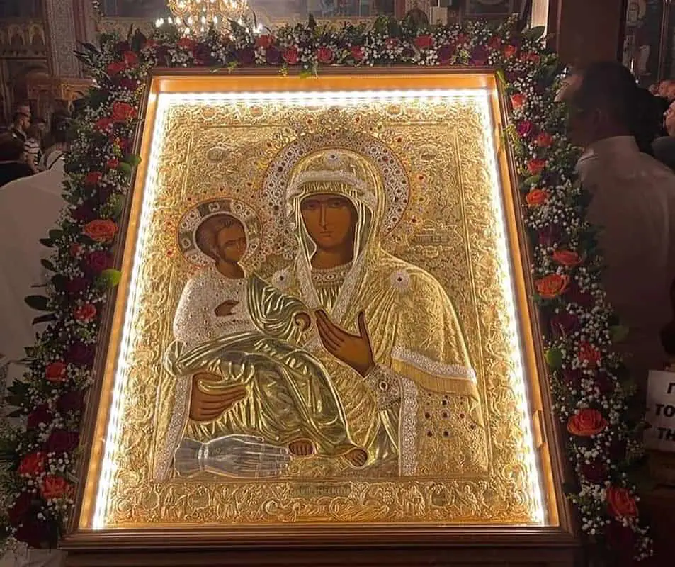 Η εικόνα της Παναγίας Τριχερούσας είναι η θαυματουργή εικόνα του Σερβικού λαού. Αρχικά βρισκόταν στην κατοχή του Αγίου Ιωάννου Δαμασκηνού, ο οποίος τη μετέφερε στην Ιερά Μονή Αγίου Σάββα της Παλαιστίνης. Πριν 800 χρόνια ο Άγιος Σάββας, Αρχιεπίσκοπος Σερβίας, τη μετέφερε στο Άγιον Όρος, αποτελώντας πλέον την εφέστια εικόνα της Ιεράς Μονής Χιλανδαρίου και το σέμνωμα του σερβικού λαού και όλων των πιστών. Το αντίγραφο της εικόνας βρίσκεται μόνιμα στον Ιερό Ναό Αγίας Φωτεινής Παραλίας, όπου καθημερινά τίθεται σε προσκύνηση, ενώ κατά καιρούς μεταφέρεται και σε άλλους Ιερούς Ναούς προς αγιασμό και ευλογία των πιστών.