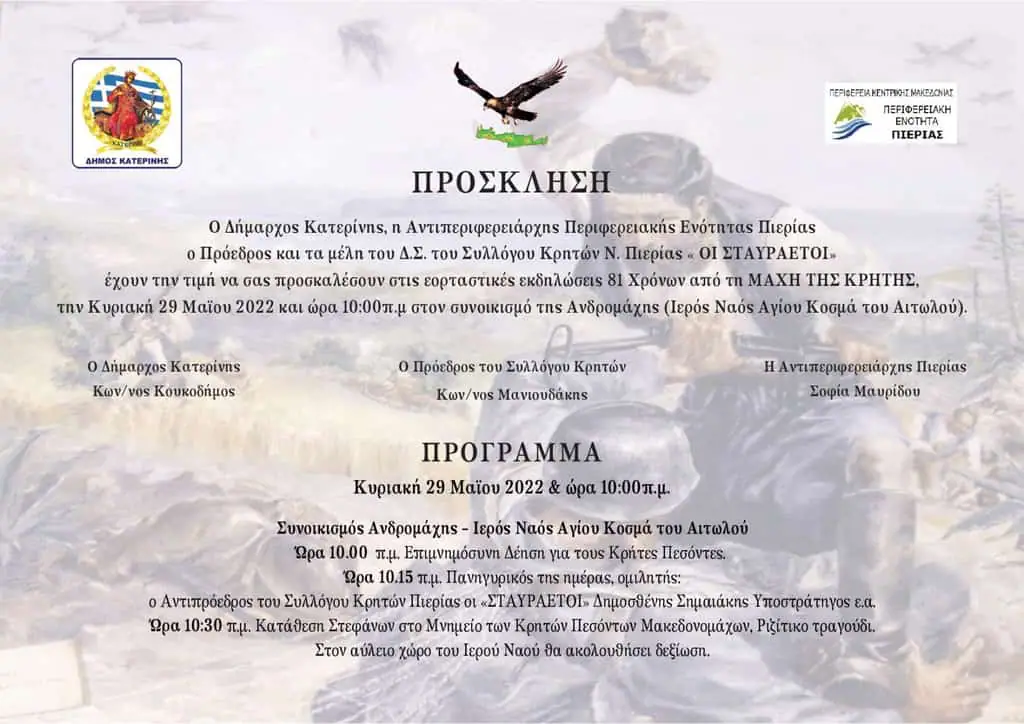 Ολύμπιο Βήμα » Επικαιρότητα » Εκδηλώσεις » Μάχη της Κρήτης: Επετειακές εορταστικές εκδηλώσεις στην Κατερίνη (πρόσκληση – πρόγραμμα)