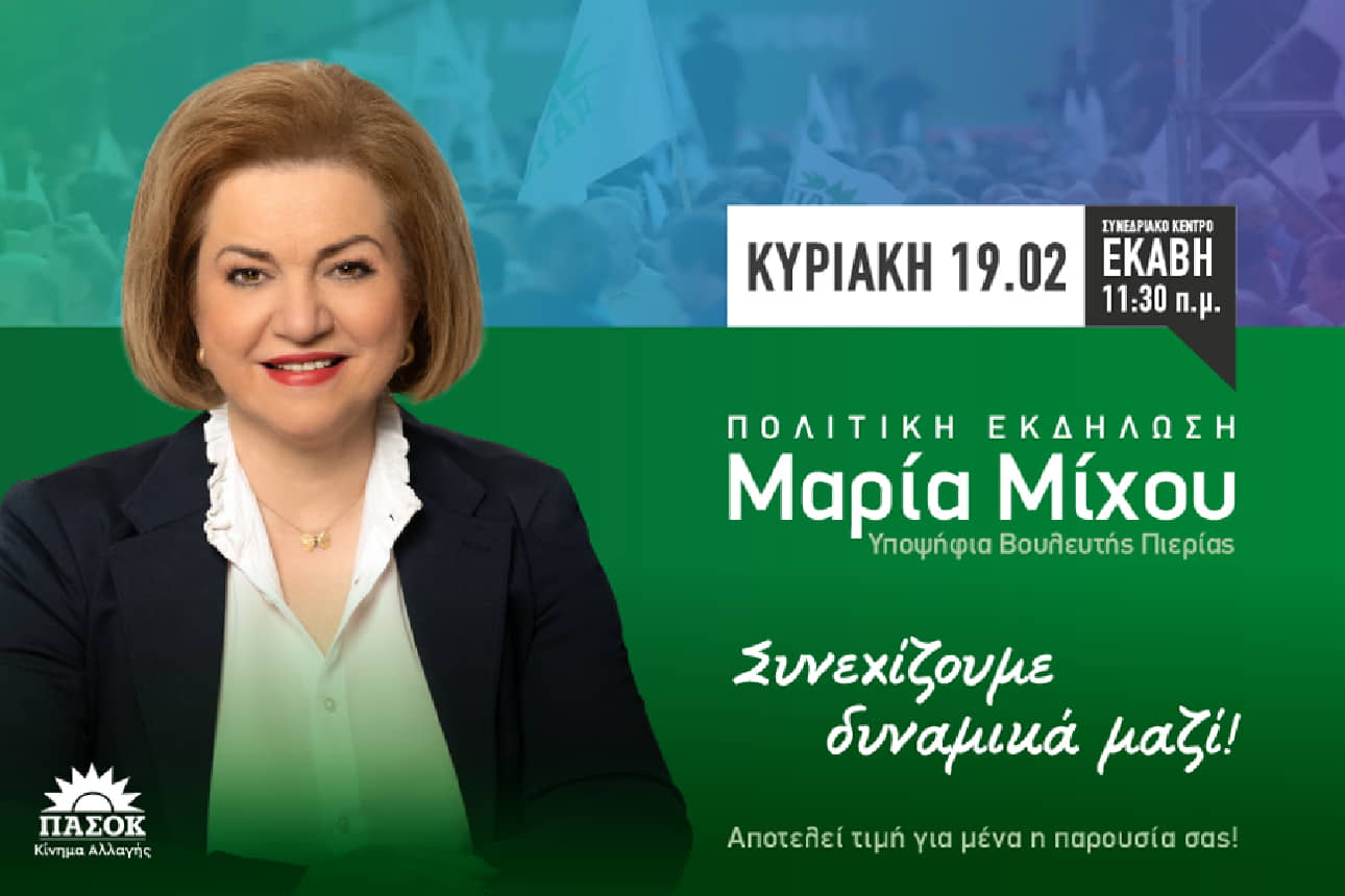 Η πρώην Βουλευτής Πιερίας, μέλος της Κεντρικής Πολιτικής Επιτροπής και εκ νέου υποψήφια Βουλευτής, Μαρία Μίχου, σε ανοικτή πρόσκληση προς τους πολίτες της Πιερίας, αλλά και με αφορμή την Κυριακάτικη ομιλία της, της 19ης Φεβρουαρίου 2023, δηλώνει: