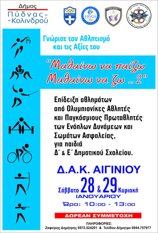 Στο πλαίσιο διοργανώσεως αθλητικών δρωμένων από το δήμο Πύδνας-Κολινδρού, το Σαββατοκύριακο 28-29 Ιανουαρίου 2023 θα πραγματοποιηθεί στο Δ.Α.Κ. Αιγινίου και σε συνεργασία με το ΓΕΕΘΑ/ΑΣΑΕΔ, την ΕΘΝΟΑ, την ΕΟΕ και το Λιμενικό Σώμα-Ελληνικής Ακτοφυλακής, η δραστηριότητα “Μαθαίνω να παίζω – Μαθαίνω να ζω -2“.