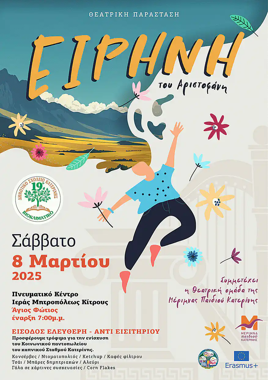 Το Σάββατο 8 Μαρτίου 2025 στις 19.00μμ στο Πνευματικό Κέντρο Άγιος Φώτιος της Ιεράς Μητρόπολης Κίτρους, Κατερίνης και Πλαταμώνα  μια μικτή ομάδα, αποτελούμενη από μαθητές/τριες της Στ1 τάξης του 19ου Δημοτικού Σχολείου Κατερίνης  και μαθητευόμενους της Μέριμνας Παιδιού Κατερίνης, θα παρουσιάσουν την «Ειρήνη» του Αριστοφάνη, κάνοντας πράξη την ιδέα της συμπερίληψης.