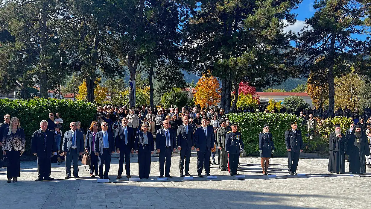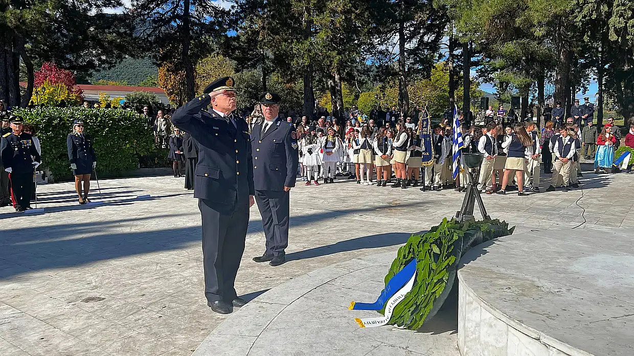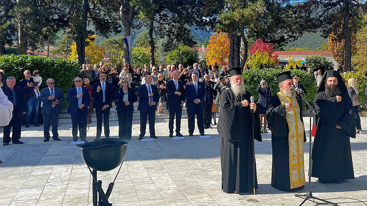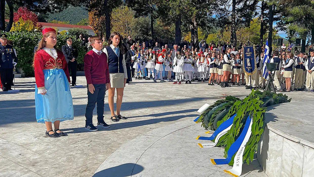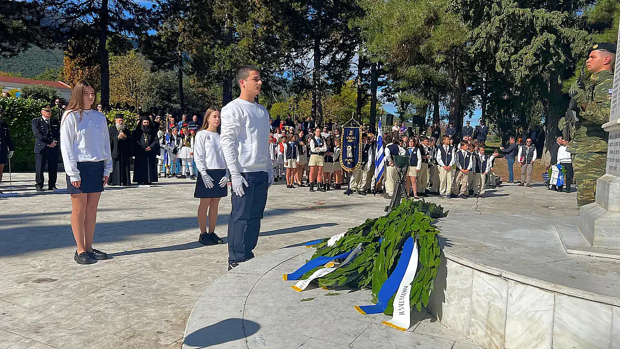 Στο μνημείο των Ηρώων, τελέστηκε επιμνημόσυνη δέηση στη μνήμη των ένδοξων πεσόντων νεκρών. Ακολούθησε κατάθεση στεφάνων από τον εκπρόσωπο της Κυβέρνησης, τον εκπρόσωπο της Βουλής, τον δήμαρχο Δίου-Ολύμπου, τον διοικητή της 24ης Τεθωρακισμένης Ταξιαρχίας Λιτοχώρου, την διοικητή του Α.Τ. Δίου-Ολύμπου, τον διοικητή της Πυροσβεστικής Υπηρεσίας Λιτοχώρου, τον πρόεδρο της δημοτικής κοινότητας Λιτοχώρου, εκπρόσωπο της Εθνικής Αντίστασης καθώς και από μαθητές ως εκπρόσωποι της πρωτοβάθμιας και δευτεροβάθμιας εκπαίδευσης. Αντίστοιχα σε κάθε κοινότητα κατατέθηκαν στεφάνια από εκπροσώπους του Δήμου, των Σωμάτων Ασφαλείας, τους προέδρους των δημοτικών κοινοτήτων και εκπροσώπους Α’θμιας-Β’θμιας εκπαίδευσης. Στο Λιτόχωρο τον πανηγυρικό λόγο εκφώνησε η εκπαιδευτικός Πολυξένη Καραστογιαννίδου.