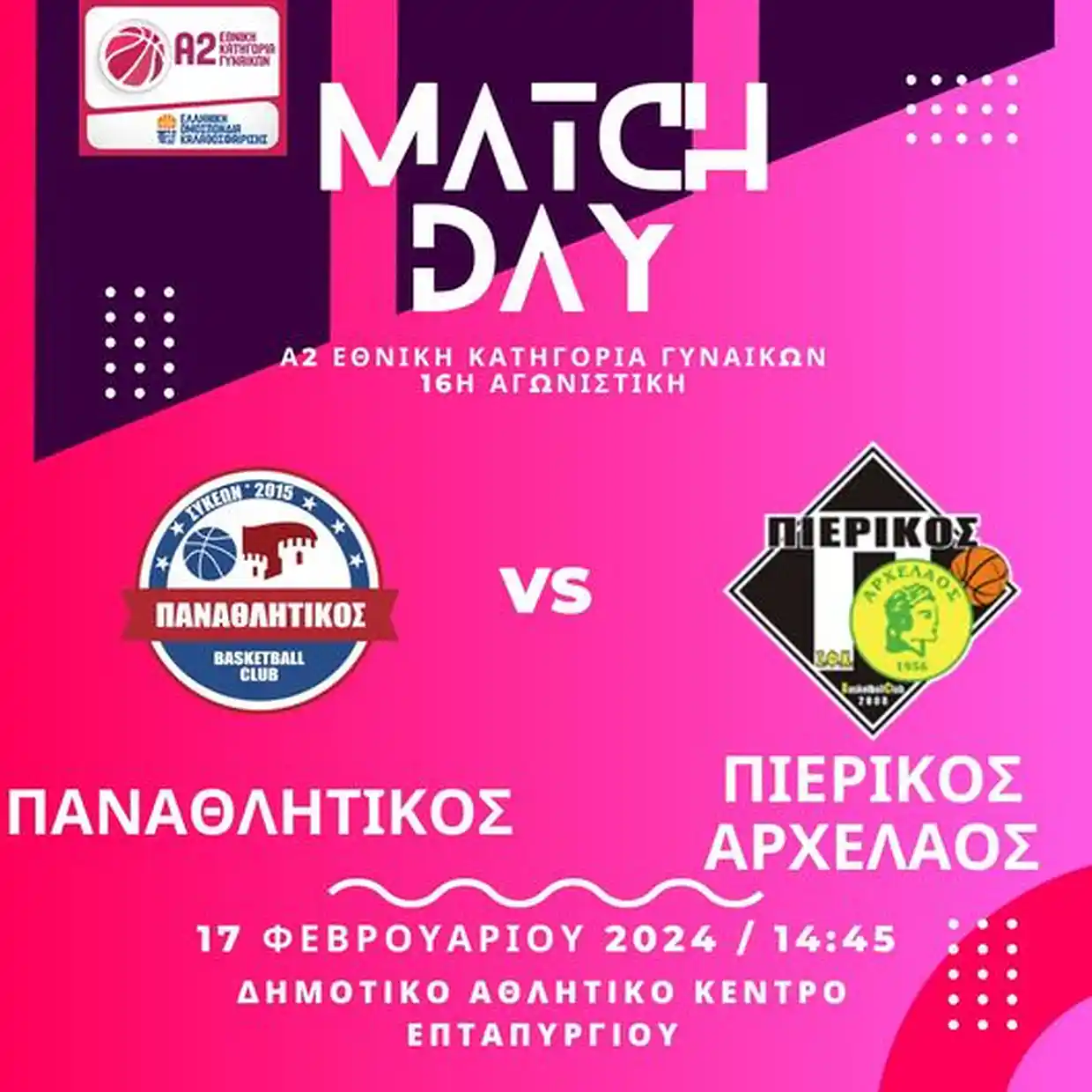 Τον Παναθλητικό (13-0) αντιμετωπίζει ο Πιερικός Αρχέλαος (7-6) τον Σάββατο 17 Φεβρουαρίου στις 14:45, στο Δημοτικό Αθλητικό Κέντρο Επταπυργίου, στο πλαίσιο της 16ης αγωνιστικής του 2ου ομίλου της Α2 Εθνικής Κατηγορίας Γυναικών.