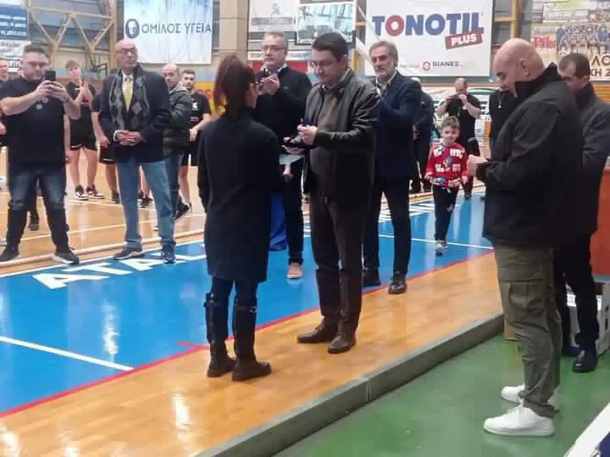 Πραγματοποιηθηκε απονομή τιμητικής πλακέτας στην σύζυγο του, Κατερίνα Παπαδοπούλου απο τον πρόεδρο Ζαΐμη Γεώργιο και τον γενικό γραμματέα της Ομοσπονδιας Ευάγγελο Κούτρα.