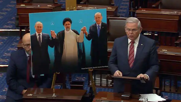 Κατά τη διάρκεια της ομιλίας του ο γερουσιαστής Μενέντεζ προσπάθησε να απεικονίσει την απόκλιση της Τουρκίας από τις δυτικές αξίες μέσω της παρουσίασης της κοινής φωτογραφίας του Ρετζέπ Ταγίπ Ερντογάν με τον πρόεδρο της Ρωσίας και του Ιράν. «Δεν αποτελεί έκπληξη που ο Ερντογάν συναντήθηκε στην Τεχεράνη αυτό το καλοκαίρι με τον Ρώσο και τον Ιρανό πρόεδρο -κάποιους από τους πιο βάναυσους δικτάτορες του κόσμου. Απλώς κοιτάξτε τους ηγέτες με τους οποίους συνεργάζεται. Είναι επειδή μοιράζεται την κοσμοθεωρία τους. Και αυτό μπορείς να το δεις καθαρά στον τρόπο που αντιλαμβάνεται την περιοχή», τόνισε χαρακτηριστικά.