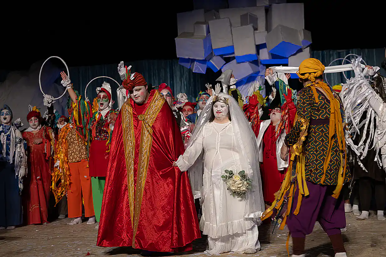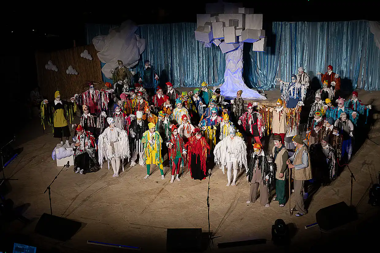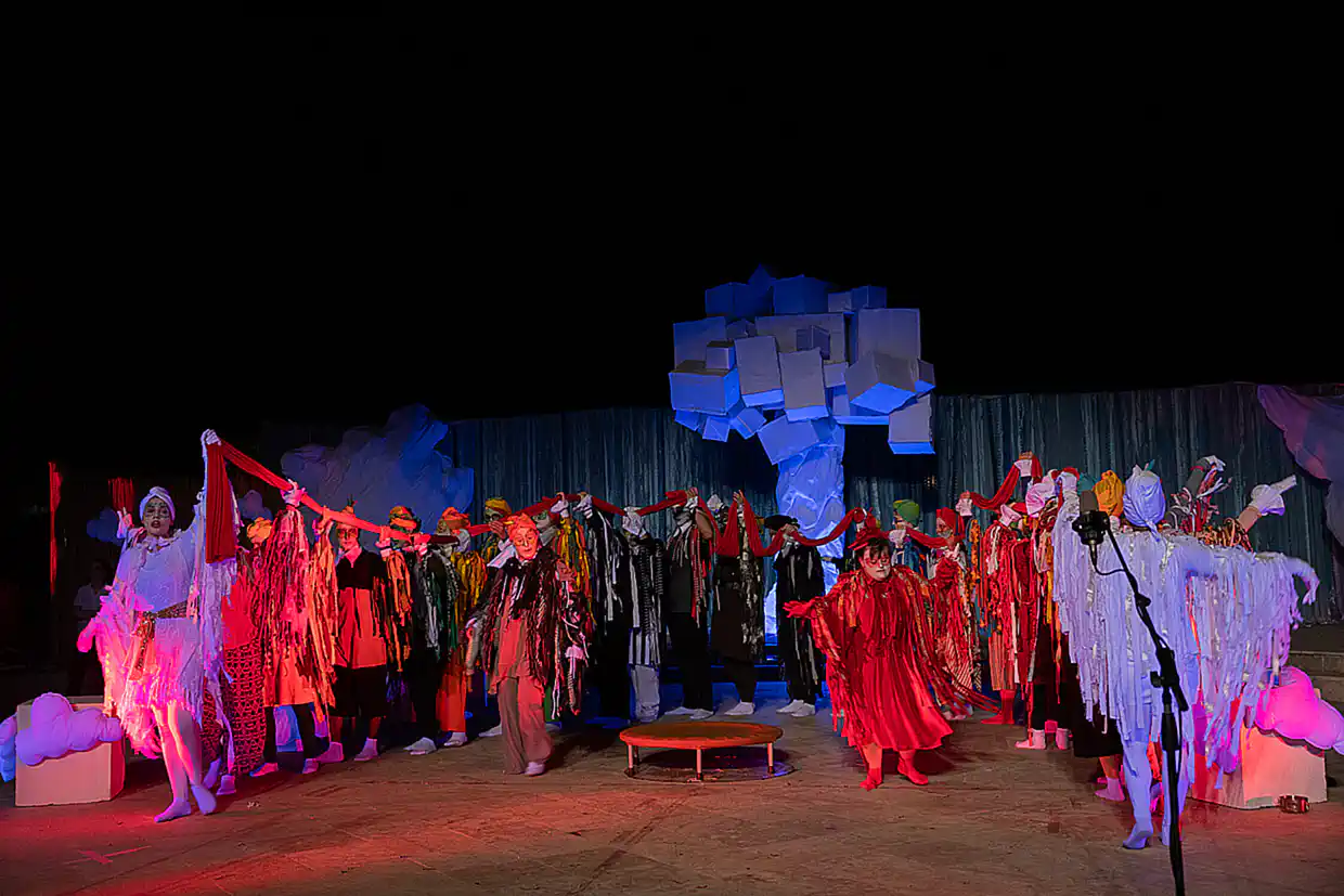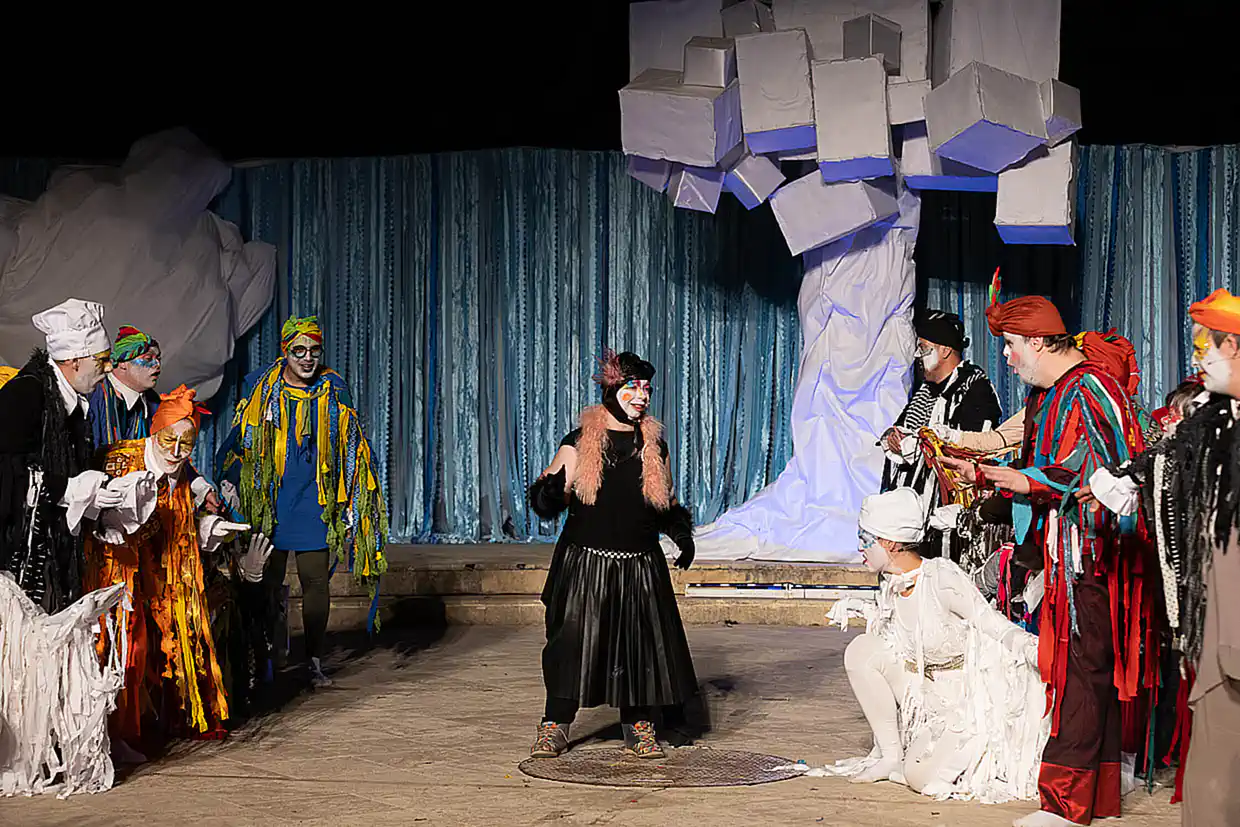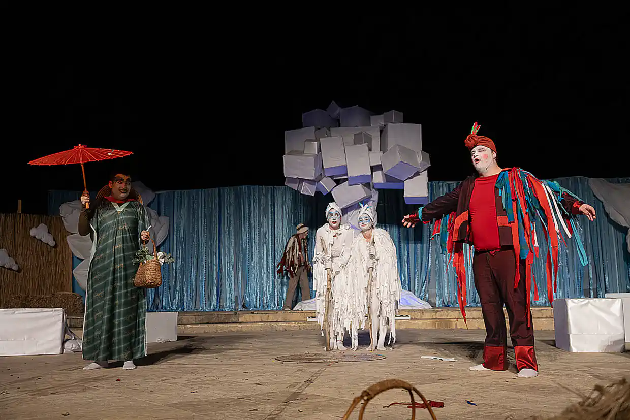 Η σκηνή του θεάτρου γέμισε με πολύχρωμα πουλιά που τραγουδούσαν και χόρευαν, δημιουργώντας μια μαγευτική ατμόσφαιρα. Την επιτυχημένη παράσταση ενορχήστρωσε η κ. Ματίνα Καρτσιούνα, μια εξαιρετικά ταλαντούχα ηθοποιός του Θεάτρου Τέχνης, η οποία ανέλαβε τον σχεδιασμό και την υλοποίηση του έργου σε συνεργασία με τη θεατρολόγο Καλλιόπη Αργυροπούλου και τη φιλόλογο Βούλα Μαγαλιά, η οποία προσάρμοσε το κείμενο στις ανάγκες της παράστασης.