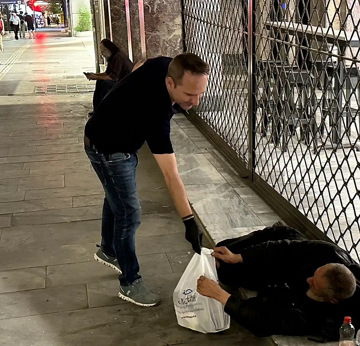 Όταν έφτασε εκεί που ήταν ο άστεγος, εκείνος ήταν ακόμα κουκουλωμένος από το κρύο και κοιτούσε ακόμη το άπειρο. Τού έδωσε τα πράγματα, του ευχήθηκε χρόνια πολλά και ζήτησε συγγνώμη που ήταν βιαστικός και έπρεπε να φύγει, αλλά τού υποσχέθηκε ότι θα ξαναπάει μια μέρα που θα έχει χρόνο και θα κάτσει να τα πούνε. Του άφησε και είκοσι ευρώ για να πάρει έναν καφέ κι έφυγε.