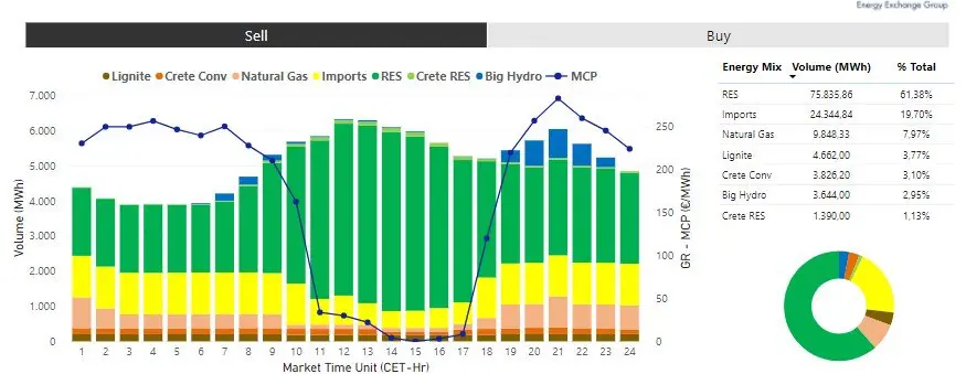 Η εικόνα αντιστρέφεται το απόγευμα όταν μειώνεται η συμμετοχή των ΑΠΕ και αυξάνεται το φυσικό αέριο για να καλύψει το κενό με αποτέλεσμα η τιμή να φθάνει στις 9 το βράδυ έως και σε 283,12 ευρώ ανά μεγαβατώρα. Ωστόσο η μέση τιμή σήμερα είναι σημαντικά μειωμένη σε σχέση με χθες καθώς διαμορφώνεται στα 168,22 ευρώ ανά μεγαβατώρα, χαμηλότερη κατά 27% σε σχέση με το Σάββατο. Συνολικά το μείγμα παραγωγής σήμερα είναι: 61,4 % ανανεώσιμες πηγές, 19,7 % εισαγωγές, 8 % φυσικό αέριο, 3,8 % λιγνίτης ενώ με 4,2 % συμμετέχει το σύστημα της Κρήτης.