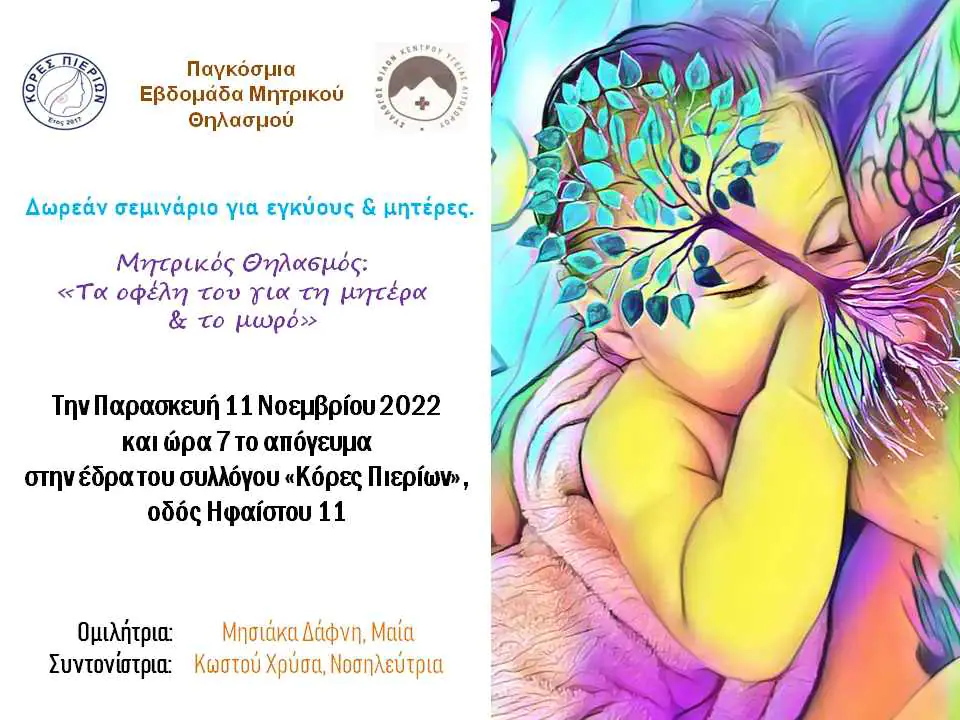 Ο σύλλογος “Κόρες Πιερίων” σε συνεργασία με τον “Σύλλογο Φίλων Κέντρου Υγείας Λιτοχώρου”, με αφορμή την Παγκόσμια Εβδομάδα Μητρικού Θηλασμού, διοργανώνει δωρεάν σεμινάριο για εγκύους και μητέρες, με θέμα: Μητρικός Θηλασμός: “Τα οφέλη του για τη μητέρα & το μωρό“.
