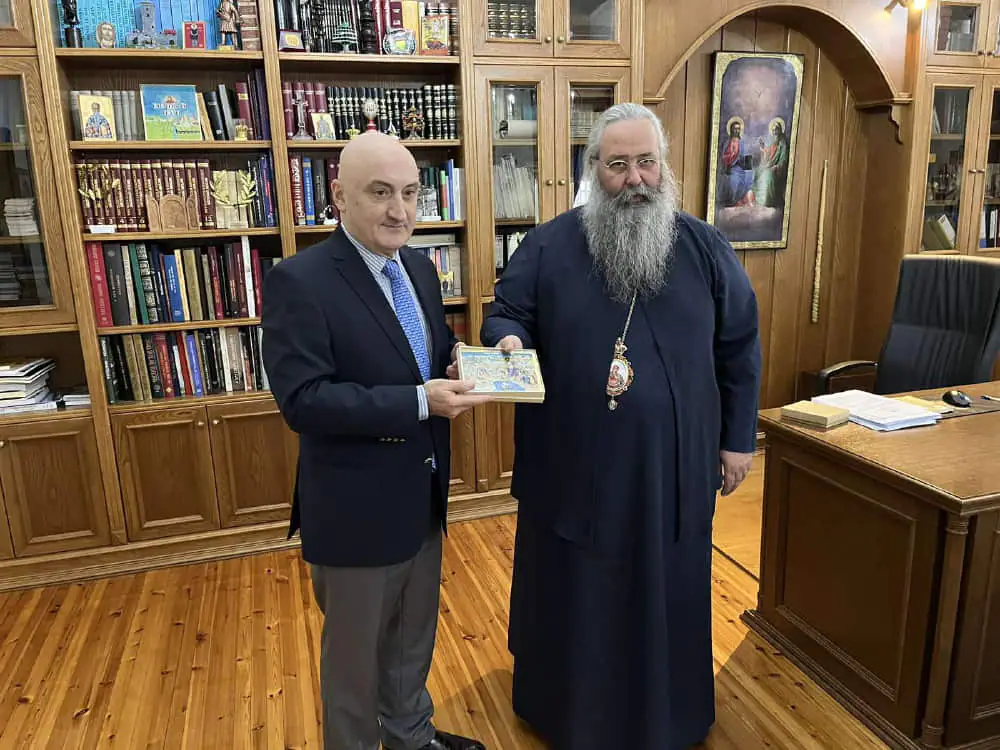 Ο Σεβασμιώτατος Ποιμενάρχης κ. Γεώργιος ανέφερε στον κ. Πρέσβη για τον Όσιο Γεώργιο Καρσλίδη που γεννήθηκε στην Γεωργία και συγκαταλέγεται μεταξύ των τοπικών Αγίων της Πιερίας. Αποτελεί μια από τις πιο ξεχωριστές και σημαντικότερες αγίες μορφές του 20ου αιώνα και απότμημα του ι. λειψάνου του φυλάσσεται στον Ενοριακό Ιερό Ναό Αγίου Δημητρίου στον Κούκο Πιερίας.
