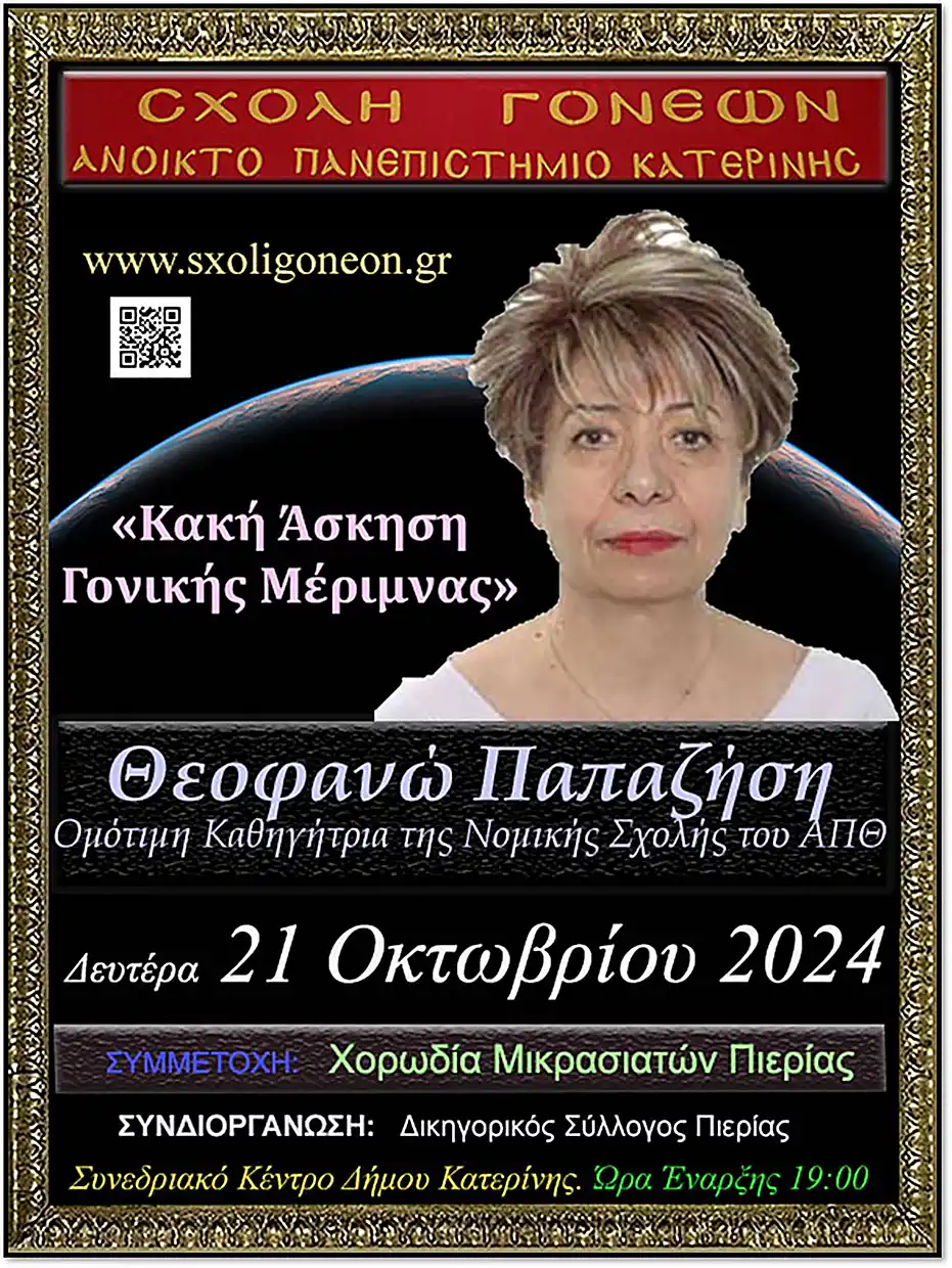 Η επόμενη εκδήλωση θα πραγματοποιηθεί την Δευτέρα 21-10-2024 με επίσημη ομιλήτρια και καλεσμένη την ομότιμη Καθηγήτρια της Νομικής Σχολής του Α.Π.Θ. κ. Θεοφανώ Παπαζήση με θέμα: «Κακή Άσκηση Γονικής Μέριμνας» σε συνδιοργάνωση με τον Δικηγορικό Σύλλογο Πιερίας.