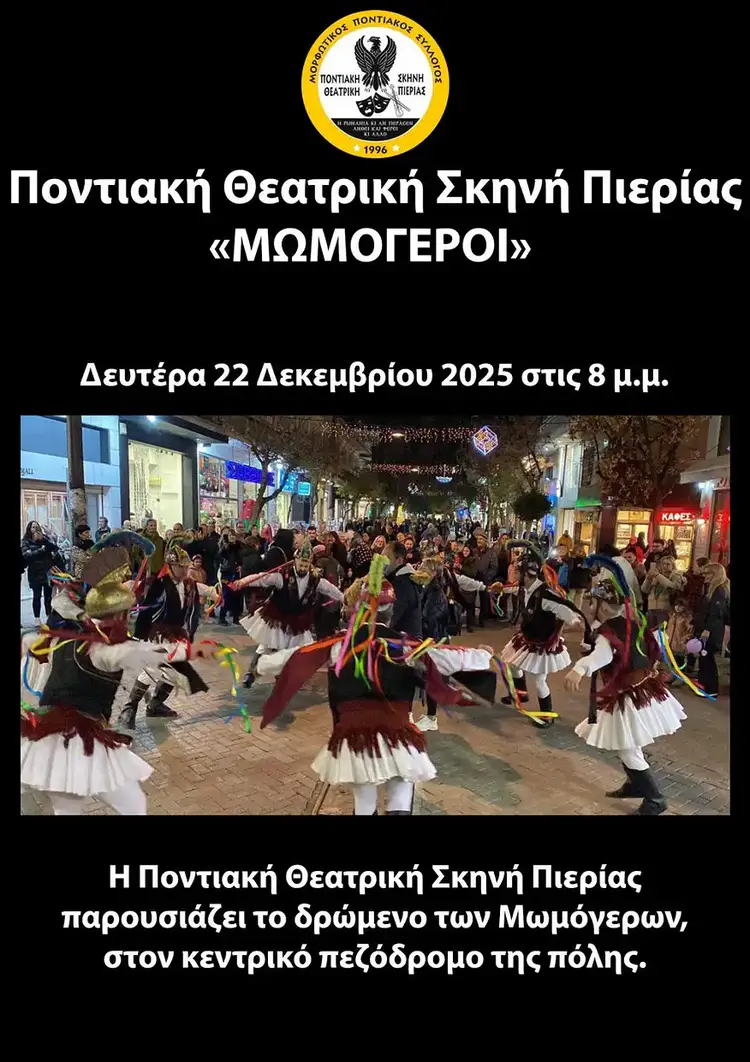 Η Ποντιακή Θεατρική Σκηνή Πιερίας ζωντανεύει σήμερα, Δευτέρα, ένα από τα πιο χαρακτηριστικά έθιμα της ποντιακής παράδοσης, παρουσιάζοντας το δρώμενο των Μωμόγερων στο κέντρο της Κατερίνης. Η εκδήλωση είναι προγραμματισμένη για τις 8:00 μ.μ. και εντάσσεται στο εορταστικό κλίμα των ημερών, φέρνοντας στο προσκήνιο ένα δρώμενο με βαθιές ρίζες στη λαϊκή μνήμη.