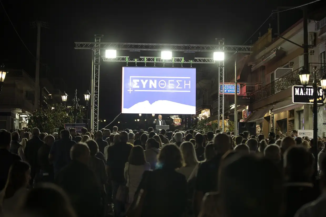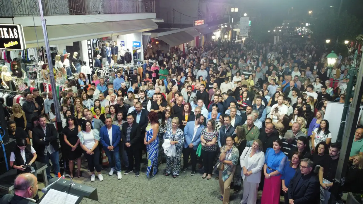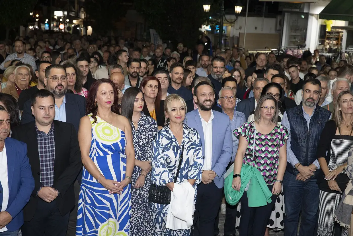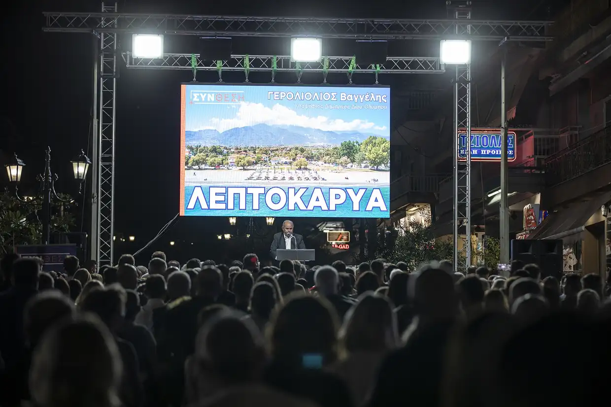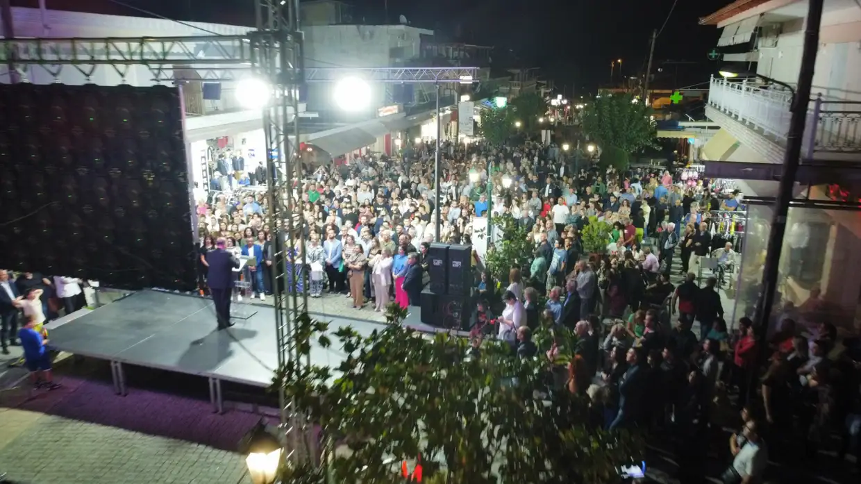 Μπροστά σε εκατοντάδες συνδημότες του στον πεζόδρομο της Λεπτοκαρυάς πραγματοποίησε την κεντρική προεκλογική του ομιλία για τη Δημοτική Ενότητα Ανατολικού Ολύμπου ο υποψήφιος δήμαρχος Δίου-Ολύμπου, Βαγγέλης Γερολιόλιος, το βράδυ του Σαββάτου 30 Σεπτεμβρίου 2023.
