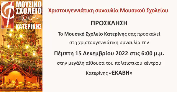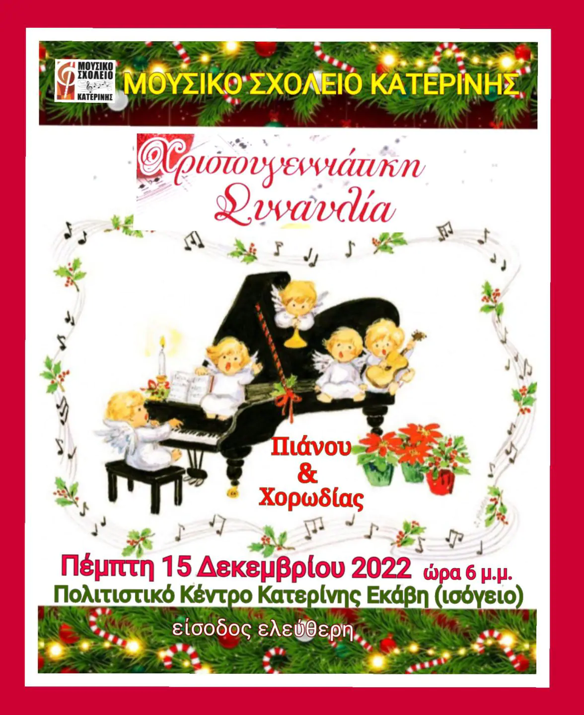 Το Μουσικό Σχολείο Κατερίνης διοργανώνει χριστουγεννιάτικη συναυλία πιάνου και χορωδίας την Πέμπτη 15 Δεκεμβρίου 2022 και ώρα 6:00 μ.μ. στο Πολιτιστικό κέντρο Εκάβη (ισόγειο) με ελεύθερη είσοδο.
