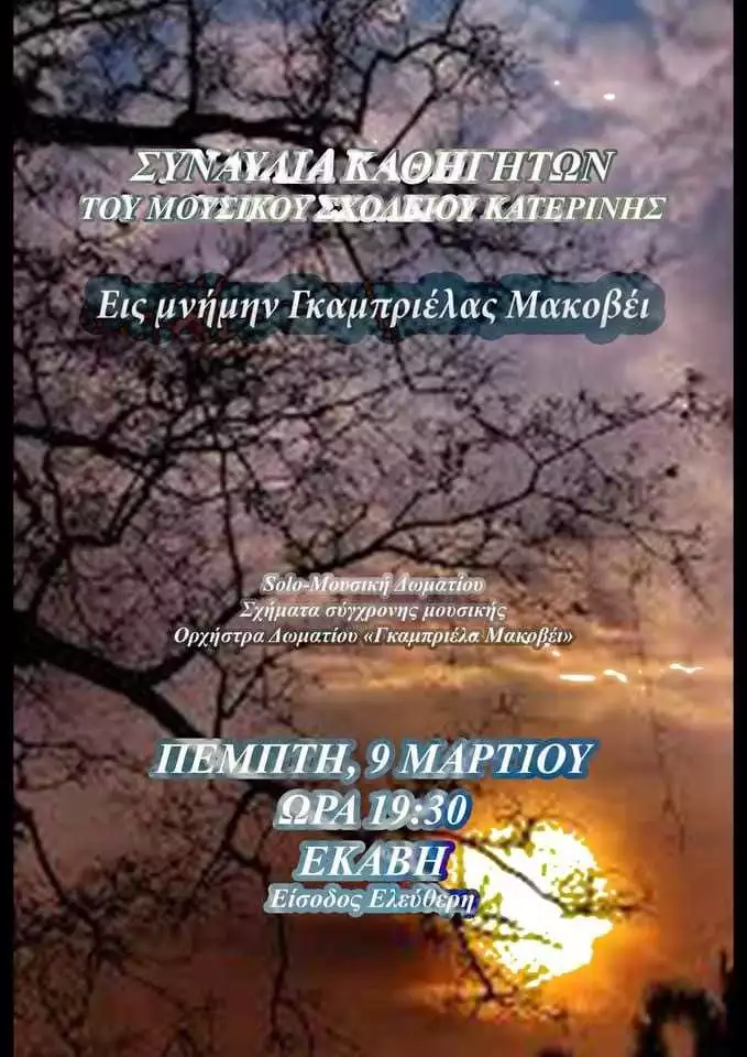 Το Μουσικό Σχολείο Κατερίνης σας προσκαλεί την Πέμπτη, 9 Μαρτίου και ώρα 7:30μ.μ στο συνεδριακό κέντρο “Εκάβη”, στη συναυλία των καθηγητών του, η οποία τελείται προς τιμήν της εκλιπούσας συναδέλφου Γκαμπριέλας Μακοβέι, αλλά και ως φόρος τιμής στα θύματα της πρόσφατης τραγωδίας που συγκλόνισε τη χώρα.