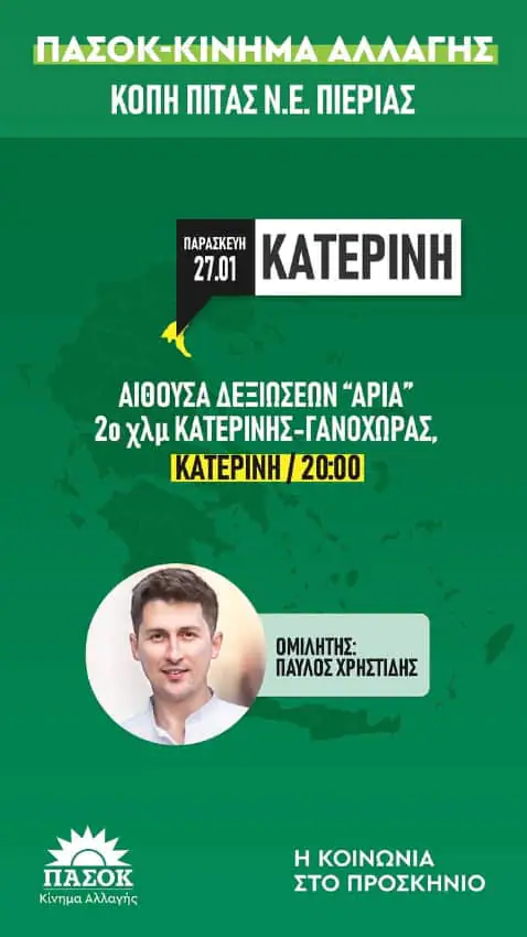 Σας προσκαλούμε στην κοπή της πρωτοχρονιάτικης πίτας της Νομαρχιακής Επιτροπής ΠΑΣΟΚ – Κίνημα Αλλαγής Πιερίας, που θα γίνει την Παρασκευή 27 Ιανουαρίου 2023 και ώρα έναρξης 8:00 μ.μ. στην αίθουσα δεξιώσεων “ΑΡΙΑ“ στο 2ο χλμ. Κατερίνης – Γανόχωρας.