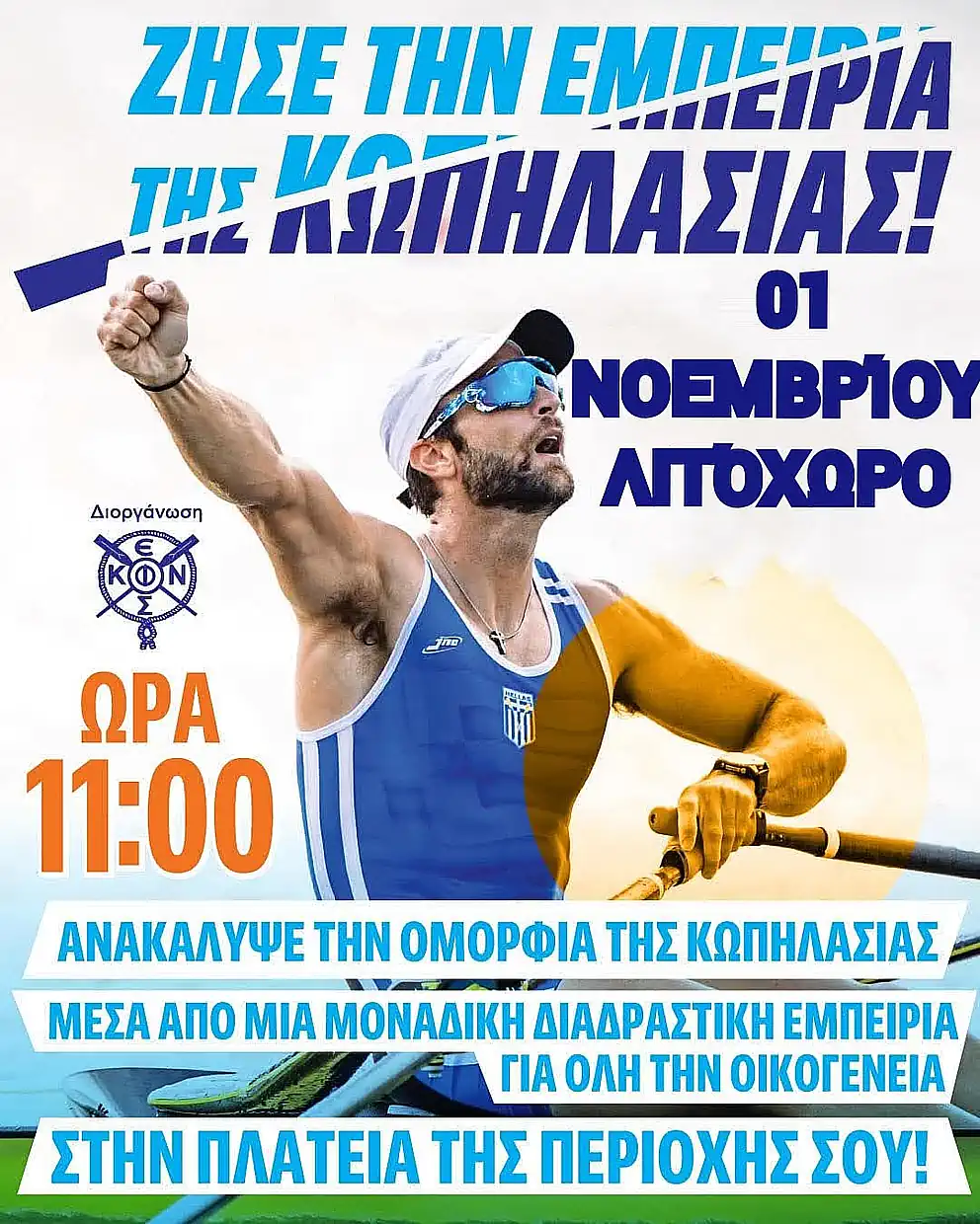 Σας περιμένουμε όλους το Σάββατο 1 Νοεμβρίου, 11:00–14:00, στο Δημοτικό Πάρκο Λιτοχώρου να γνωρίσετε από κοντά την ομορφιά και τη δυναμική της Κωπηλασίας – ενός αθλήματος που εμπνέει πειθαρχία, συνεργασία και αγάπη για το νερό!