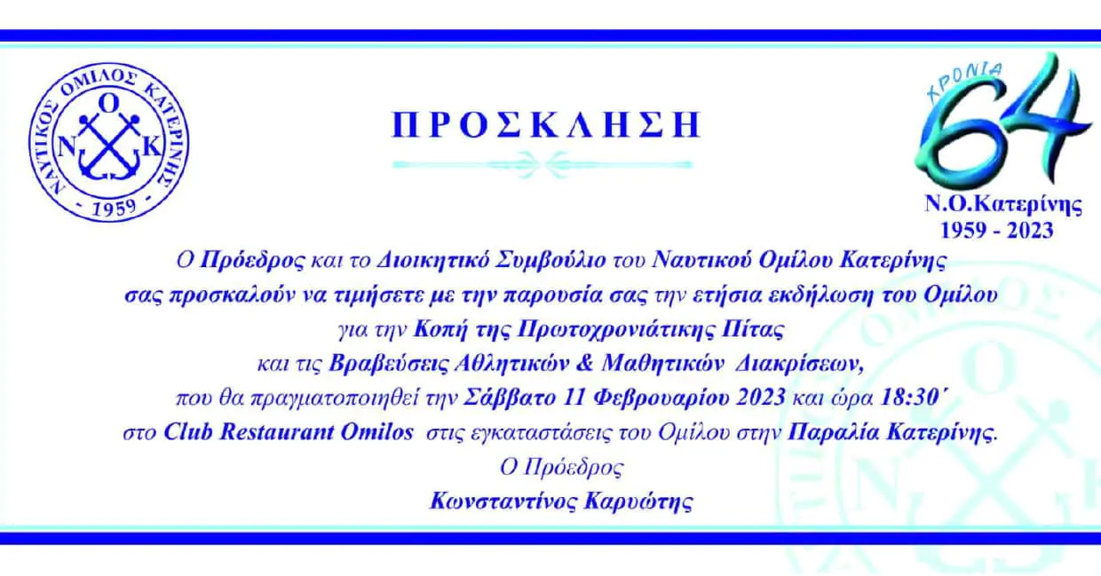 Ο Ναυτικός Όμιλος Κατερίνης σας προσκαλεί στην ετήσια κοπή της πίτας όπου θα βραβευτούν οι αθλητές μας για τις αθλητικές και τις μαθητικές τους διακρίσεις, την ημερα Σάββατο 11 Φεβρουαρίου και ώρα 18:30 στο Club Restaurant Omilos στις εγκαταστάσεις μας στην Παραλία Κατερίνης.