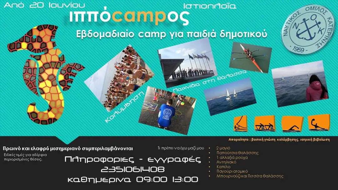 Μετά από δυο επιτυχημένες χρονιές διοργάνωσης του Ιππόκαμπου, έτσι και φέτος, ο Ναυτικός Όμιλος Κατερίνης περιμένει, από τις 20 Ιουνίου 2022 και για 10 ολόκληρες εβδομάδες, τους μικρούς του φίλους για να διασκεδάσουν και να γνωρίσουν τη θάλασσα!!! Το πρόγραμμα περιλαμβάνει κολύμβηση, ιστιοπλοΐα και εκπαιδευτικά παιχνίδια τόσο στη θάλασσα όσο και στη στεριά!!!