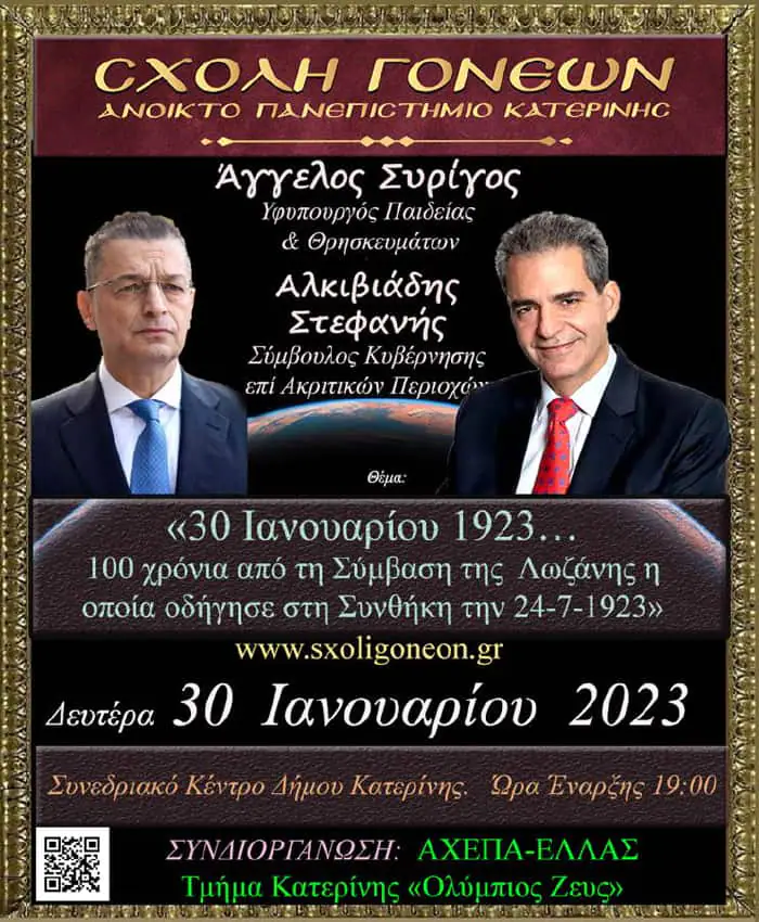 Ακριβώς εκατό χρόνια μετά την έναρξη των συνομιλιών για την Σύμβαση της Λωζάνης την 31η Ιανουαρίου 1923 η Σχολή Γονέων Ανοικτό Πανεπιστήμιο Κατερίνης έχει την εξαιρετική χαρά και τιμή να φιλοξενεί την Δευτέρα 30 Ιανουαρίου 2023 στις 19:00 τον Υφυπουργό Παιδείας και Θρησκευμάτων κ. Άγγελο Συρίγο και τον σύμβουλο της κυβέρνησης επί Ακριτικών Περιοχών πρ. Υφ. Άμυνας και στρατηγό ε.α. κ. Αλκιβιάδη Στεφανή