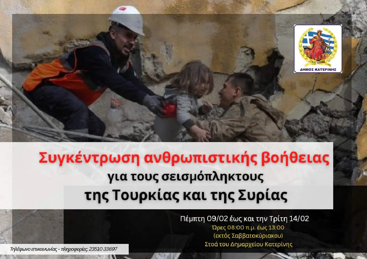 «Καλούμε τους φορείς, τους πολιτιστικούς και αθλητικούς συλλόγους, τα σωματεία και τους συμπολίτες με την συνδρομή τους να εκφράσουν και έμπρακτα την συμπαράσταση και αλληλεγγύη τους προς τους σεισμόπληκτους της Τουρκίας και της Συρίας» σημειώνει σε δήλωσή του, ο Δήμαρχος Κατερίνης Κώστας Κουκοδήμος.