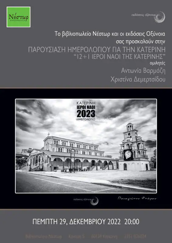 Την Πέμπτη 29, Δεκεμβρίου 2022 στις 20:00 ώρα, το βιβλιοπωλείο Νέστωρ και οι εκδόσεις Οξύνοια σας προσκαλούν στην παρουσίαση του ημερολογίου για την Κατερίνη, “12+1, Ιεροί Ναοί της Κατερίνης”.