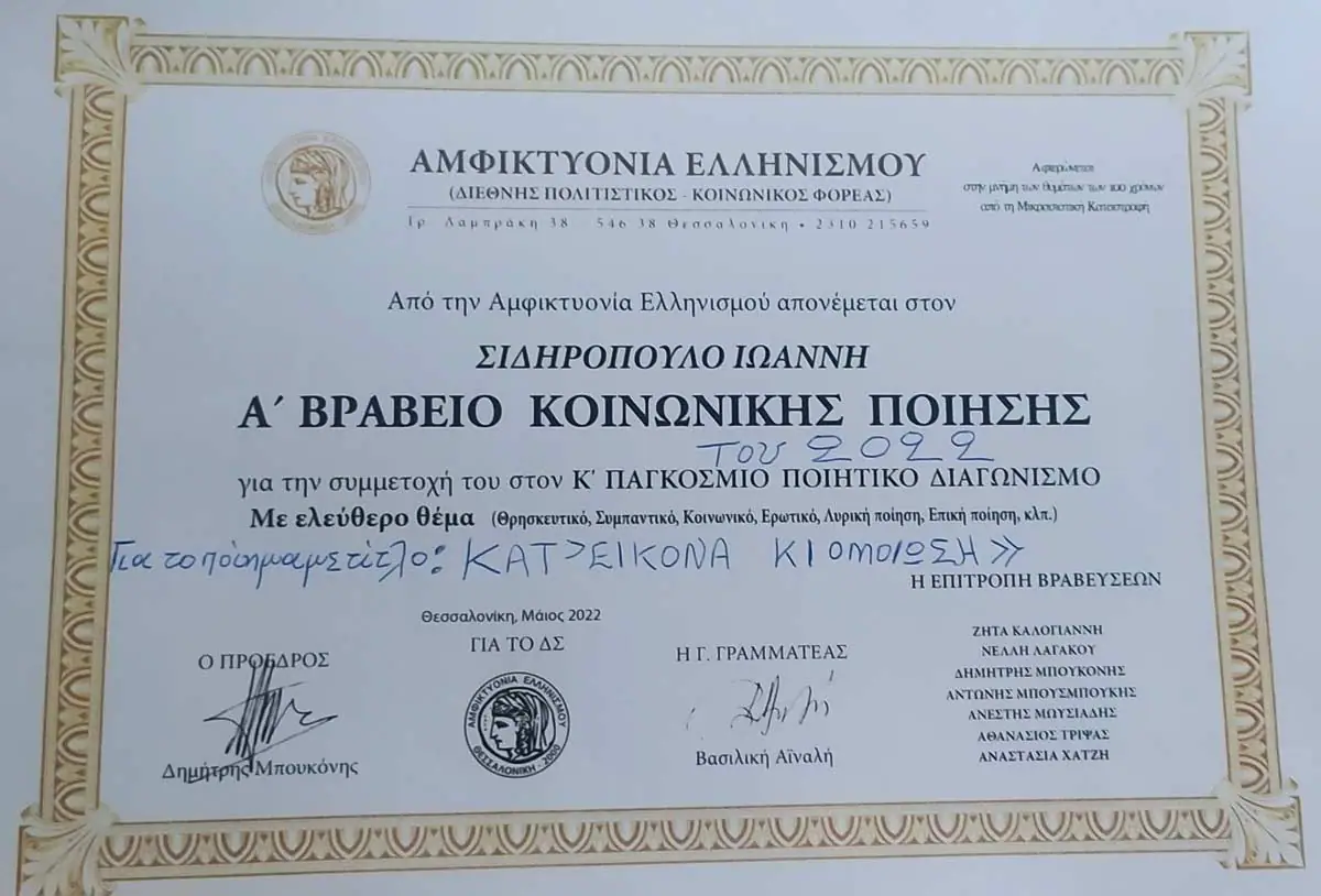 Ο Δικηγόρος Γιάννης Σιδηρόπουλος απέσπασε και φέτος το πρώτο βραβείο, μεταξύ 200 συμμετεχόντων, στον 110 παγκόσμιο διαγωνισμό ποίησης με ελεύθερο θέμα, για το έτος 2022.