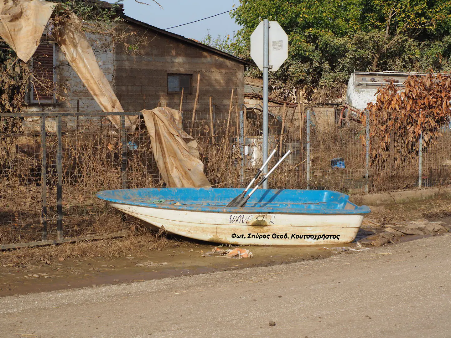 Μία βάρκα με κουπιά στην άκρη του δρόμου, η διχρωμία στα κεραμίδια των κατοικιών – μέχρι εκεί έφτασε η στάθμη του νερού, συσκευή τηλεόρασης κρεμασμένη στην εξωτερική κεραία της, ρούχα λασπωμένα στην αυλή ενός σπιτιού, που η στάθμη του νερού έφτασε πάνω από τα παράθυρα, μαρτυρούν το μέγεθος της καταστροφής!